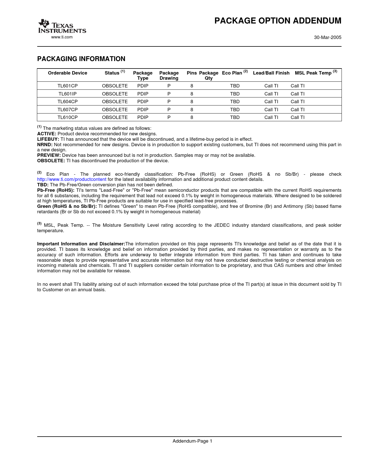 The information provided on this page represents TI's knowledge and belief as of the date that it is provided. TI bases its knowledge and belief on information provided by third parties, and makes no representation or warranty as to the accuracy of such information. Efforts are underway to better integrate information from third parties. TI has taken and continues to take reasonable steps to provide representative and accurate information but may not have conducted destructive testing or chemical analysis on incoming materials and chemicals. TI and TI suppliers consider certain information to be proprietary, and thus CAS numbers and other limited information may not be available for release. In no event shall TI's liability arising out of such information exceed the total purchase price of the TI part(s) at issue in this document sold by TI to Customer on an annual basis. Addendum-Page 1