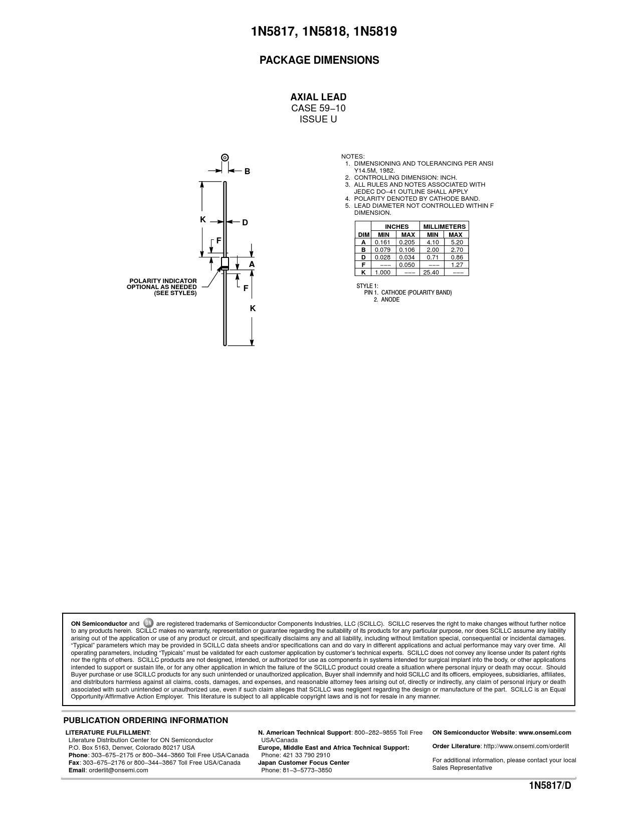 1N5817, 1N5818, 1N5819PACKAGE DIMENSIONSAXIAL LEAD CASE 59−10 ISSUE U NOTES: 1. DIMENSIONING AND TOLERANCING PER ANSI B Y14.5M, 1982. 2. CONTROLLING DIMENSION: INCH. 3. ALL RULES AND NOTES ASSOCIATED WITH JEDEC DO−41 OUTLINE SHALL APPLY 4. POLARITY DENOTED BY CATHODE BAND. 5. LEAD DIAMETER NOT CONTROLLED WITHIN F DIMENSION. KDINCHESMILLIMETERSDIMMINMAXMINMAXFA 0.161 0.205 4.10 5.20 B 0.079 0.106 2.00 2.70 D 0.028 0.034 0.71 0.86 AF −−− 0.050 −−− 1.27 K 1.000 −−− 25.40 −−− POLARITY INDICATOROPTIONAL AS NEEDEDF STYLE 1: (SEE STYLES) PIN 1. CATHODE (POLARITY BAND) 2. ANODE KON Semiconductor and are registered trademarks of Semiconductor Components Industries, LLC (SCILLC). SCILLC reserves the right to make changes without further notice to any products herein. SCILLC makes no warranty, representation or guarantee regarding the suitability of its products for any particular purpose, nor does SCILLC assume any liability arising out of the application or use of any product or circuit, and specifically disclaims any and all liability, including without limitation special, consequential or incidental damages. “Typical” parameters which may be provided in SCILLC data sheets and/or specifications can and do vary in different applications and actual performance may vary over time. All operating parameters, including “Typicals” must be validated for each customer application by customer’s technical experts. SCILLC does not convey any license under its patent rights nor the rights of others. SCILLC products are not designed, intended, or authorized for use as components in systems intended for surgical implant into the body, or other applications intended to support or sustain life, or for any other application in which the failure of the SCILLC product could create a situation where personal injury or death may occur. Should Buyer purchase or use SCILLC products for any such unintended or unauthorized application, Buyer shall indemnify and hold SCILLC and its officers, employees, subsidiaries, affiliates, and distributors harmless against all claims, costs, damages, and expenses, and reasonable attorney fees arising out of, directly or indirectly, any claim of personal injury or death associated with such unintended or unauthorized use, even if such claim alleges that SCILLC was negligent regarding the design or manufacture of the part. SCILLC is an Equal Opportunity/Affirmative Action Employer. This literature is subject to all applicable copyright laws and is not for resale in any manner. PUBLICATION ORDERING INFORMATIONLITERATURE FULFILLMENT : N. American Technical Support : 800−282−9855 Toll Free ON Semiconductor Website : www.onsemi.com Literature Distribution Center for ON Semiconductor USA/Canada P.O. Box 5163, Denver, Colorado 80217 USA Europe, Middle East and Africa Technical Support:Order Literature : http://www.onsemi.com/orderlit Phone : 303−675−2175 or 800−344−3860 Toll Free USA/Canada Phone: 421 33 790 2910 Fax : 303−675−2176 or 800−344−3867 Toll Free USA/Canada Japan Customer Focus Center For additional information, please contact your local Email : orderlit@onsemi.com Phone: 81−3−5773−3850 Sales Representative http://onsemi.com1N5817/D7