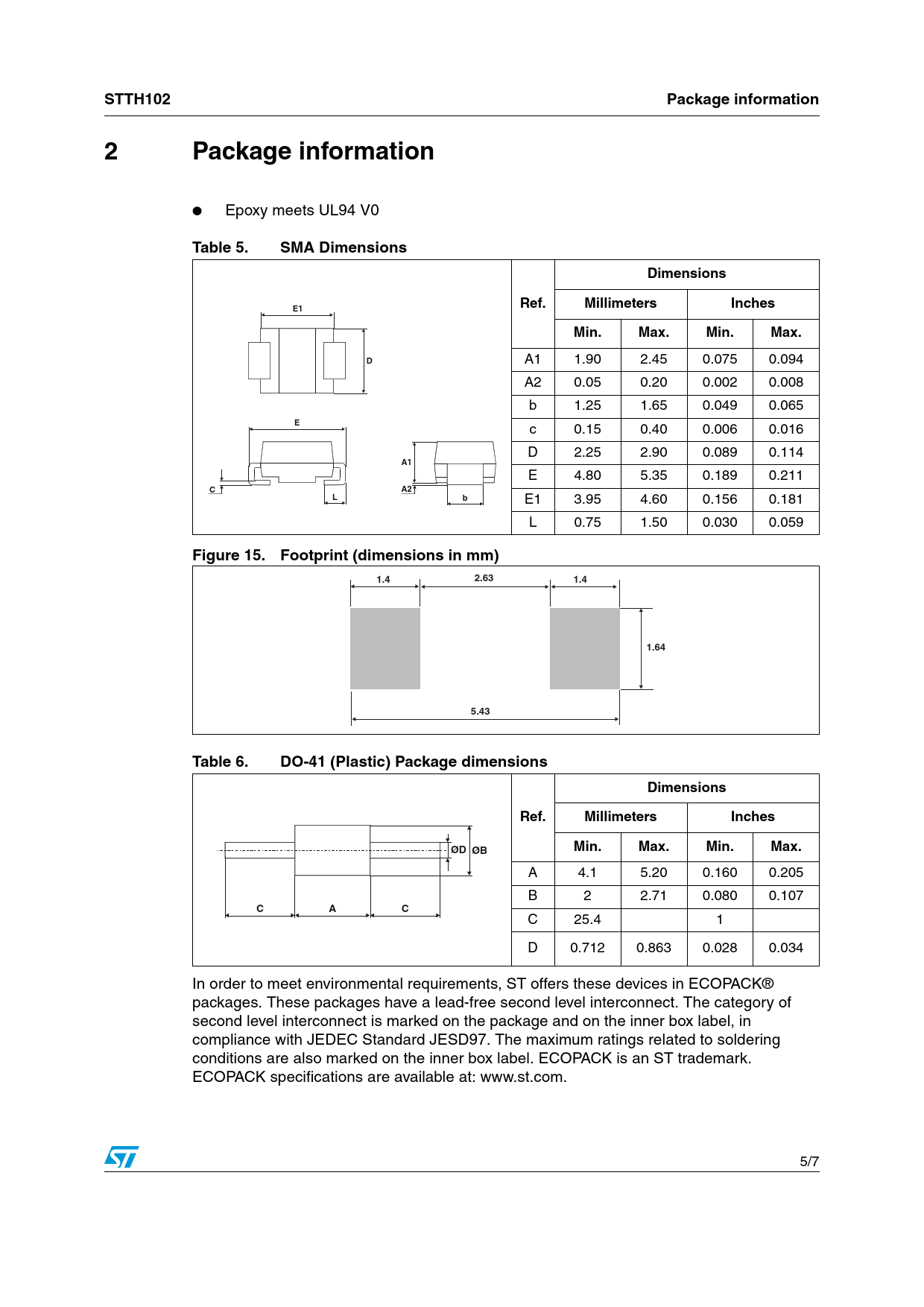 STTH102Package information2 Packageinformation ● Epoxy meets UL94 V0 Table 5.SMA DimensionsDimensionsRef.MillimetersInchesE1Min.Max.Min.Max.D A1 1.90 2.45 0.075 0.094 A2 0.05 0.20 0.002 0.008 b 1.25 1.65 0.049 0.065 E c 0.15 0.40 0.006 0.016 D 2.25 2.90 0.089 0.114 A1 E 4.80 5.35 0.189 0.211 CA2Lb E1 3.95 4.60 0.156 0.181 L 0.75 1.50 0.030 0.059 Figure 15.Footprint (dimensions in mm)1.42.631.41.645.43Table 6.DO-41 (Plastic) Package dimensionsDimensionsRef.MillimetersInchesØDMin.Max.Min.Max.ØB A 4.1 5.20 0.160 0.205 B 2 2.71 0.080 0.107 CAC C 25.4 1 D 0.712 0.863 0.028 0.034 In order to meet environmental requirements, ST offers these devices in ECOPACK® packages. These packages have a lead-free second level interconnect. The category of second level interconnect is marked on the package and on the inner box label, in compliance with JEDEC Standard JESD97. The maximum ratings related to soldering conditions are also marked on the inner box label. ECOPACK is an ST trademark. ECOPACK specifications are available at: www.st.com. 5/7 Document Outline STTH102 High efficiency ultrafast diode Table 1. Absolute ratings (limiting values) 1 Characteristics Table 2. Thermal resistance Table 3. Static Electrical Characteristics Table 4. Dynamic electrical characteristics Figure 1. Average forward power dissipation versus average forward current (SMA) Figure 2. Average forward power dissipation versus average forward current (DO-41) Figure 3. Average forward current versus ambient temperature (d = 0.5) (SMA) Figure 4. Average forward current versus ambient temperature (d = 0.5) (DO-41) Figure 5. Relative variation of thermal impedance junction to ambient versus pulse duration (epoxy printed circuit board, e(Cu) = 35 µm, recommended pad layout) (SMA) Figure 6. Relative variation of thermal impedance junction to ambient versus pulse duration (DO-41) Figure 7. Forward voltage drop versus forward current Figure 8. Junction capacitance versus reverse voltage applied (typical values) Figure 9. Reverse recovery time versus dIF/dt (90% confidence) Figure 10. Peak recovery current versus dIF/dt (90% confidence) Figure 11. Reverse recovery charges versus dIF/dt (90% confidence) Figure 12. Relative variations of dynamic parameters versus junction temperature Figure 13. Thermal resistance junction to ambient versus copper surface under each lead (Epoxy printed circuit board FR4, copper thickness: 35 µm) (SMA) Figure 14. Thermal resistance versus lead length (DO-41) 2 Package information Table 5. SMA Dimensions Figure 15. Footprint (dimensions in mm) Table 6. DO-41 (Plastic) Package dimensions 3 Ordering information 4 Revision history