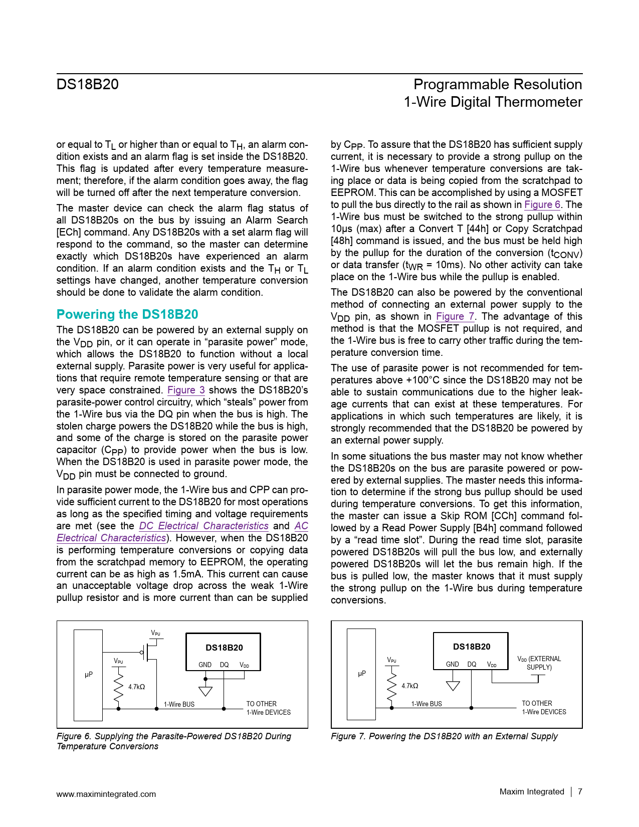 link to page 5 link to page 2 link to page 3 link to page 3 link to page 7 link to page 7 DS18B20 Programmable Resolution 1-Wire Digital Thermometer or equal to TL or higher than or equal to TH, an alarm con- by CPP. To assure that the DS18B20 has sufficient supply dition exists and an alarm flag is set inside the DS18B20. current, it is necessary to provide a strong pullup on the This flag is updated after every temperature measure- 1-Wire bus whenever temperature conversions are tak- ment; therefore, if the alarm condition goes away, the flag ing place or data is being copied from the scratchpad to will be turned off after the next temperature conversion. EEPROM. This can be accomplished by using a MOSFET The master device can check the alarm flag status of to pull the bus directly to the rail as shown in Figure 6. The all DS18B20s on the bus by issuing an Alarm Search 1-Wire bus must be switched to the strong pullup within [ECh] command. Any DS18B20s with a set alarm flag will 10µs (max) after a Convert T [44h] or Copy Scratchpad respond to the command, so the master can determine [48h] command is issued, and the bus must be held high exactly which DS18B20s have experienced an alarm by the pullup for the duration of the conversion (tCONV) condition. If an alarm condition exists and the T or data transfer (t H or TL WR = 10ms). No other activity can take settings have changed, another temperature conversion place on the 1-Wire bus while the pullup is enabled. should be done to validate the alarm condition. The DS18B20 can also be powered by the conventional method of connecting an external power supply to the Powering the DS18B20 VDD pin, as shown in Figure 7. The advantage of this The DS18B20 can be powered by an external supply on method is that the MOSFET pullup is not required, and the VDD pin, or it can operate in “parasite power” mode, the 1-Wire bus is free to carry other traffic during the tem- which allows the DS18B20 to function without a local perature conversion time. external supply. Parasite power is very useful for applica- The use of parasite power is not recommended for tem- tions that require remote temperature sensing or that are peratures above +100°C since the DS18B20 may not be very space constrained. Figure 3 shows the DS18B20’s able to sustain communications due to the higher leak- parasite-power control circuitry, which “steals” power from age currents that can exist at these temperatures. For the 1-Wire bus via the DQ pin when the bus is high. The applications in which such temperatures are likely, it is stolen charge powers the DS18B20 while the bus is high, strongly recommended that the DS18B20 be powered by and some of the charge is stored on the parasite power an external power supply. capacitor (CPP) to provide power when the bus is low. When the DS18B20 is used in parasite power mode, the In some situations the bus master may not know whether V the DS18B20s on the bus are parasite powered or pow- DD pin must be connected to ground. ered by external supplies. The master needs this informa- In parasite power mode, the 1-Wire bus and CPP can pro- tion to determine if the strong bus pullup should be used vide sufficient current to the DS18B20 for most operations during temperature conversions. To get this information, as long as the specified timing and voltage requirements the master can issue a Skip ROM [CCh] command fol- are met (see the DC Electrical Characteristics and AC lowed by a Read Power Supply [B4h] command followed Electrical Characteristics). However, when the DS18B20 by a “read time slot”. During the read time slot, parasite is performing temperature conversions or copying data powered DS18B20s will pull the bus low, and externally from the scratchpad memory to EEPROM, the operating powered DS18B20s will let the bus remain high. If the current can be as high as 1.5mA. This current can cause bus is pulled low, the master knows that it must supply an unacceptable voltage drop across the weak 1-Wire the strong pullup on the 1-Wire bus during temperature pullup resistor and is more current than can be supplied conversions. VPU DS18B20DS18B20 V V PU V DD (EXTERNAL GND DQ V PU DD GND DQ VDD SUPPLY) µP µP 4.7kΩ 4.7kΩ 1-Wire BUS TO OTHER 1-Wire BUS TO OTHER 1-Wire DEVICES 1-Wire DEVICES Figure 6. Supplying the Parasite-Powered DS18B20 During Figure 7. Powering the DS18B20 with an External Supply Temperature Conversions www.maximintegrated.com Maxim Integrated │ 7