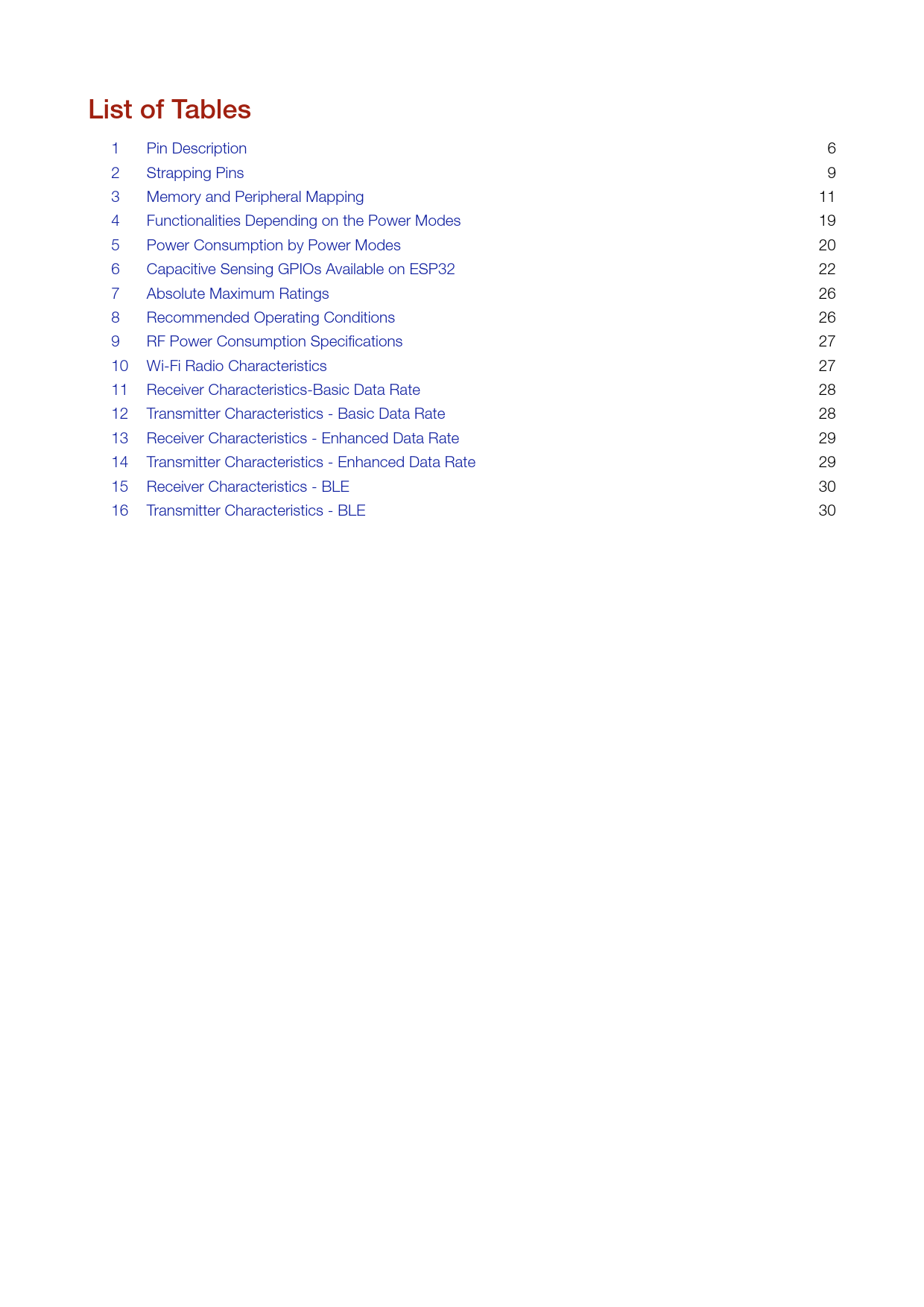 link to page 13 link to page 16 link to page 18 link to page 26 link to page 27 link to page 29 link to page 33 link to page 33 link to page 34 link to page 34 link to page 35 link to page 35 link to page 36 link to page 36 link to page 37 link to page 37 List of Tables 1 Pin Description 6 2 Strapping Pins 9 3 Memory and Peripheral Mapping 11 4 Functionalities Depending on the Power Modes 19 5 Power Consumption by Power Modes 20 6 Capacitive Sensing GPIOs Available on ESP32 22 7 Absolute Maximum Ratings 26 8 Recommended Operating Conditions 26 9 RF Power Consumption Specifications 27 10 Wi-Fi Radio Characteristics 27 11 Receiver Characteristics-Basic Data Rate 28 12 Transmitter Characteristics - Basic Data Rate 28 13 Receiver Characteristics - Enhanced Data Rate 29 14 Transmitter Characteristics - Enhanced Data Rate 29 15 Receiver Characteristics - BLE 30 16 Transmitter Characteristics - BLE 30 Document Outline Overview Featured Solutions Ultra Low Power Solution Complete Integration Solution Basic Protocols Wi-Fi Bluetooth MCU and Advanced Features CPU and Memory Clocks and Timers Advanced Peripheral Interfaces Security Development Support Application Block Diagram Pin Definitions Pin Layout Pin Description Power Scheme Strapping Pins Functional Description CPU and Memory CPU Internal Memory External Flash and SRAM Memory Map Timers and Watchdogs 64-bit Timers Watchdog Timers System Clocks CPU Clock RTC Clock Audio PLL Clock Radio 2.4 GHz Receiver 2.4 GHz Transmitter Clock Generator Wi-Fi Wi-Fi Radio and Baseband Wi-Fi MAC Wi-Fi Firmware Packet Traffic Arbitration (PTA) Bluetooth Bluetooth Radio and Baseband Bluetooth Interface Bluetooth Stack Bluetooth Link Controller RTC and Low-Power Management Peripheral Interface General Purpose Input / Output Interface (GPIO) Analog-to-Digital Converter (ADC) Ultra Low Noise Analog Pre-Amplifier Hall Sensor Digital-to-Analog Converter (DAC) Temperature Sensor Touch Sensor Ultra-Lower-Power Coprocessor Ethernet MAC Interface SD/SDIO/MMC Host Controller Universal Asynchronous Receiver Transmitter (UART) I2C Interface I2S Interface Infrared Remote Controller Pulse Counter Pulse Width Modulation (PWM) LED PWM Serial Peripheral Interface (SPI) Accelerator Electrical Characteristics Absolute Maximum Ratings Recommended Operating Conditions RF Power Consumption Specifications Wi-Fi Radio Bluetooth Radio Receiver - Basic Data Rate Transmitter - Basic Data Rate Receiver - Enhanced Data Rate Transmitter - Enhanced Data Rate Bluetooth LE Radio Receiver Transmitter Package Information Supported Resources Related Documentation Community Resources Appendix A - Touch Sensor Appendix B - Code Examples
