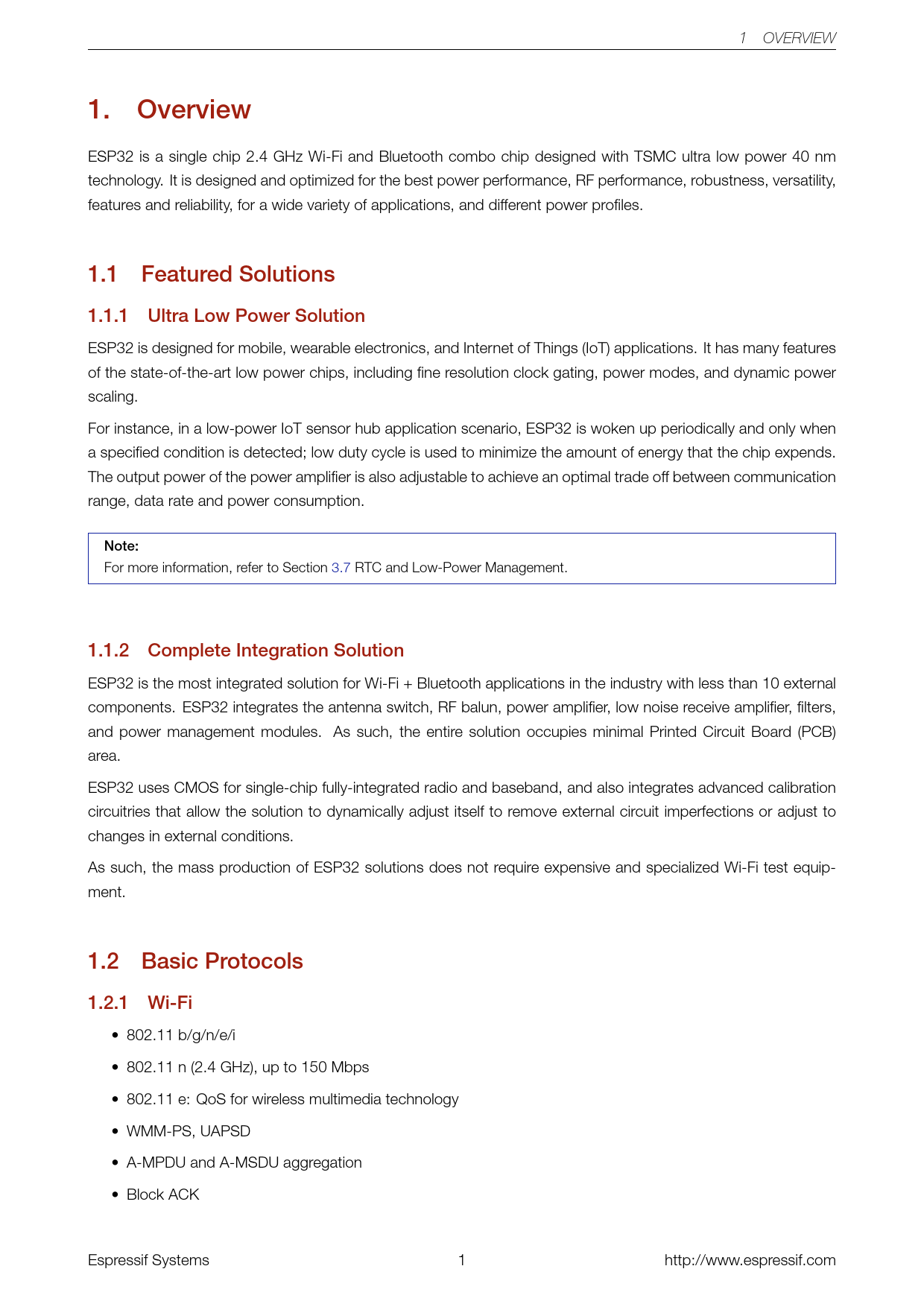 link to page 26 1 OVERVIEW 1. Overview ESP32 is a single chip 2.4 GHz Wi-Fi and Bluetooth combo chip designed with TSMC ultra low power 40 nm technology. It is designed and optimized for the best power performance, RF performance, robustness, versatility, features and reliability, for a wide variety of applications, and different power profiles. 1.1 Featured Solutions 1.1.1 Ultra Low Power Solution ESP32 is designed for mobile, wearable electronics, and Internet of Things (IoT) applications. It has many features of the state-of-the-art low power chips, including fine resolution clock gating, power modes, and dynamic power scaling. For instance, in a low-power IoT sensor hub application scenario, ESP32 is woken up periodically and only when a specified condition is detected; low duty cycle is used to minimize the amount of energy that the chip expends. The output power of the power amplifier is also adjustable to achieve an optimal trade off between communication range, data rate and power consumption. Note: For more information, refer to Section 3.7 RTC and Low-Power Management. 1.1.2 Complete Integration Solution ESP32 is the most integrated solution for Wi-Fi + Bluetooth applications in the industry with less than 10 external components. ESP32 integrates the antenna switch, RF balun, power amplifier, low noise receive amplifier, filters, and power management modules. As such, the entire solution occupies minimal Printed Circuit Board (PCB) area. ESP32 uses CMOS for single-chip fully-integrated radio and baseband, and also integrates advanced calibration circuitries that allow the solution to dynamically adjust itself to remove external circuit imperfections or adjust to changes in external conditions. As such, the mass production of ESP32 solutions does not require expensive and specialized Wi-Fi test equip- ment. 1.2 Basic Protocols 1.2.1 Wi-Fi • 802.11 b/g/n/e/i • 802.11 n (2.4 GHz), up to 150 Mbps • 802.11 e: QoS for wireless multimedia technology • WMM-PS, UAPSD • A-MPDU and A-MSDU aggregation • Block ACK Espressif Systems 1 http://www.espressif.com Document Outline Overview Featured Solutions Ultra Low Power Solution Complete Integration Solution Basic Protocols Wi-Fi Bluetooth MCU and Advanced Features CPU and Memory Clocks and Timers Advanced Peripheral Interfaces Security Development Support Application Block Diagram Pin Definitions Pin Layout Pin Description Power Scheme Strapping Pins Functional Description CPU and Memory CPU Internal Memory External Flash and SRAM Memory Map Timers and Watchdogs 64-bit Timers Watchdog Timers System Clocks CPU Clock RTC Clock Audio PLL Clock Radio 2.4 GHz Receiver 2.4 GHz Transmitter Clock Generator Wi-Fi Wi-Fi Radio and Baseband Wi-Fi MAC Wi-Fi Firmware Packet Traffic Arbitration (PTA) Bluetooth Bluetooth Radio and Baseband Bluetooth Interface Bluetooth Stack Bluetooth Link Controller RTC and Low-Power Management Peripheral Interface General Purpose Input / Output Interface (GPIO) Analog-to-Digital Converter (ADC) Ultra Low Noise Analog Pre-Amplifier Hall Sensor Digital-to-Analog Converter (DAC) Temperature Sensor Touch Sensor Ultra-Lower-Power Coprocessor Ethernet MAC Interface SD/SDIO/MMC Host Controller Universal Asynchronous Receiver Transmitter (UART) I2C Interface I2S Interface Infrared Remote Controller Pulse Counter Pulse Width Modulation (PWM) LED PWM Serial Peripheral Interface (SPI) Accelerator Electrical Characteristics Absolute Maximum Ratings Recommended Operating Conditions RF Power Consumption Specifications Wi-Fi Radio Bluetooth Radio Receiver - Basic Data Rate Transmitter - Basic Data Rate Receiver - Enhanced Data Rate Transmitter - Enhanced Data Rate Bluetooth LE Radio Receiver Transmitter Package Information Supported Resources Related Documentation Community Resources Appendix A - Touch Sensor Appendix B - Code Examples