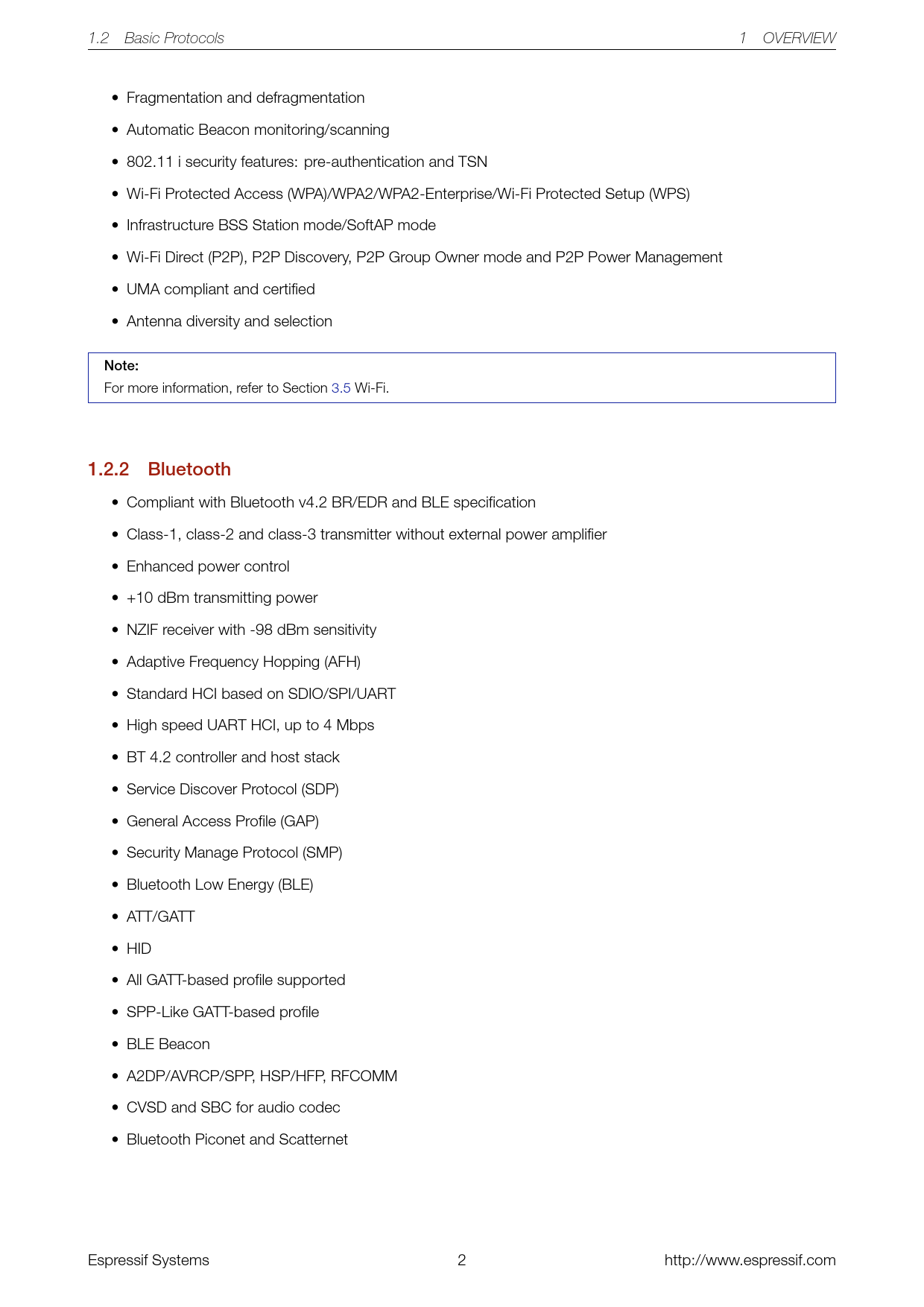 link to page 22 1.2 Basic Protocols 1 OVERVIEW • Fragmentation and defragmentation • Automatic Beacon monitoring/scanning • 802.11 i security features: pre-authentication and TSN • Wi-Fi Protected Access (WPA)/WPA2/WPA2-Enterprise/Wi-Fi Protected Setup (WPS) • Infrastructure BSS Station mode/SoftAP mode • Wi-Fi Direct (P2P), P2P Discovery, P2P Group Owner mode and P2P Power Management • UMA compliant and certified • Antenna diversity and selection Note: For more information, refer to Section 3.5 Wi-Fi. 1.2.2 Bluetooth • Compliant with Bluetooth v4.2 BR/EDR and BLE specification • Class-1, class-2 and class-3 transmitter without external power amplifier • Enhanced power control • +10 dBm transmitting power • NZIF receiver with -98 dBm sensitivity • Adaptive Frequency Hopping (AFH) • Standard HCI based on SDIO/SPI/UART • High speed UART HCI, up to 4 Mbps • BT 4.2 controller and host stack • Service Discover Protocol (SDP) • General Access Profile (GAP) • Security Manage Protocol (SMP) • Bluetooth Low Energy (BLE) • ATT/GATT • HID • All GATT-based profile supported • SPP-Like GATT-based profile • BLE Beacon • A2DP/AVRCP/SPP, HSP/HFP, RFCOMM • CVSD and SBC for audio codec • Bluetooth Piconet and Scatternet Espressif Systems 2 http://www.espressif.com Document Outline Overview Featured Solutions Ultra Low Power Solution Complete Integration Solution Basic Protocols Wi-Fi Bluetooth MCU and Advanced Features CPU and Memory Clocks and Timers Advanced Peripheral Interfaces Security Development Support Application Block Diagram Pin Definitions Pin Layout Pin Description Power Scheme Strapping Pins Functional Description CPU and Memory CPU Internal Memory External Flash and SRAM Memory Map Timers and Watchdogs 64-bit Timers Watchdog Timers System Clocks CPU Clock RTC Clock Audio PLL Clock Radio 2.4 GHz Receiver 2.4 GHz Transmitter Clock Generator Wi-Fi Wi-Fi Radio and Baseband Wi-Fi MAC Wi-Fi Firmware Packet Traffic Arbitration (PTA) Bluetooth Bluetooth Radio and Baseband Bluetooth Interface Bluetooth Stack Bluetooth Link Controller RTC and Low-Power Management Peripheral Interface General Purpose Input / Output Interface (GPIO) Analog-to-Digital Converter (ADC) Ultra Low Noise Analog Pre-Amplifier Hall Sensor Digital-to-Analog Converter (DAC) Temperature Sensor Touch Sensor Ultra-Lower-Power Coprocessor Ethernet MAC Interface SD/SDIO/MMC Host Controller Universal Asynchronous Receiver Transmitter (UART) I2C Interface I2S Interface Infrared Remote Controller Pulse Counter Pulse Width Modulation (PWM) LED PWM Serial Peripheral Interface (SPI) Accelerator Electrical Characteristics Absolute Maximum Ratings Recommended Operating Conditions RF Power Consumption Specifications Wi-Fi Radio Bluetooth Radio Receiver - Basic Data Rate Transmitter - Basic Data Rate Receiver - Enhanced Data Rate Transmitter - Enhanced Data Rate Bluetooth LE Radio Receiver Transmitter Package Information Supported Resources Related Documentation Community Resources Appendix A - Touch Sensor Appendix B - Code Examples