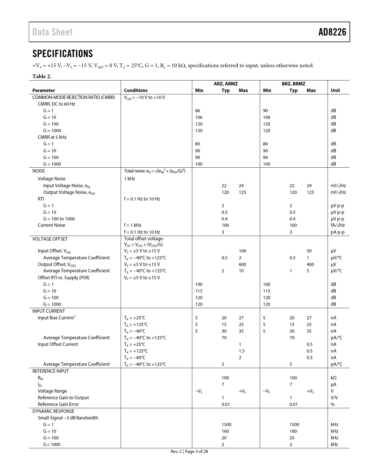 Data Sheet AD8226 SPECIFICATIONS Table 2 ARZ, ARMZ BRZ, BRMZ Parameter Conditions Min Typ Max Unit