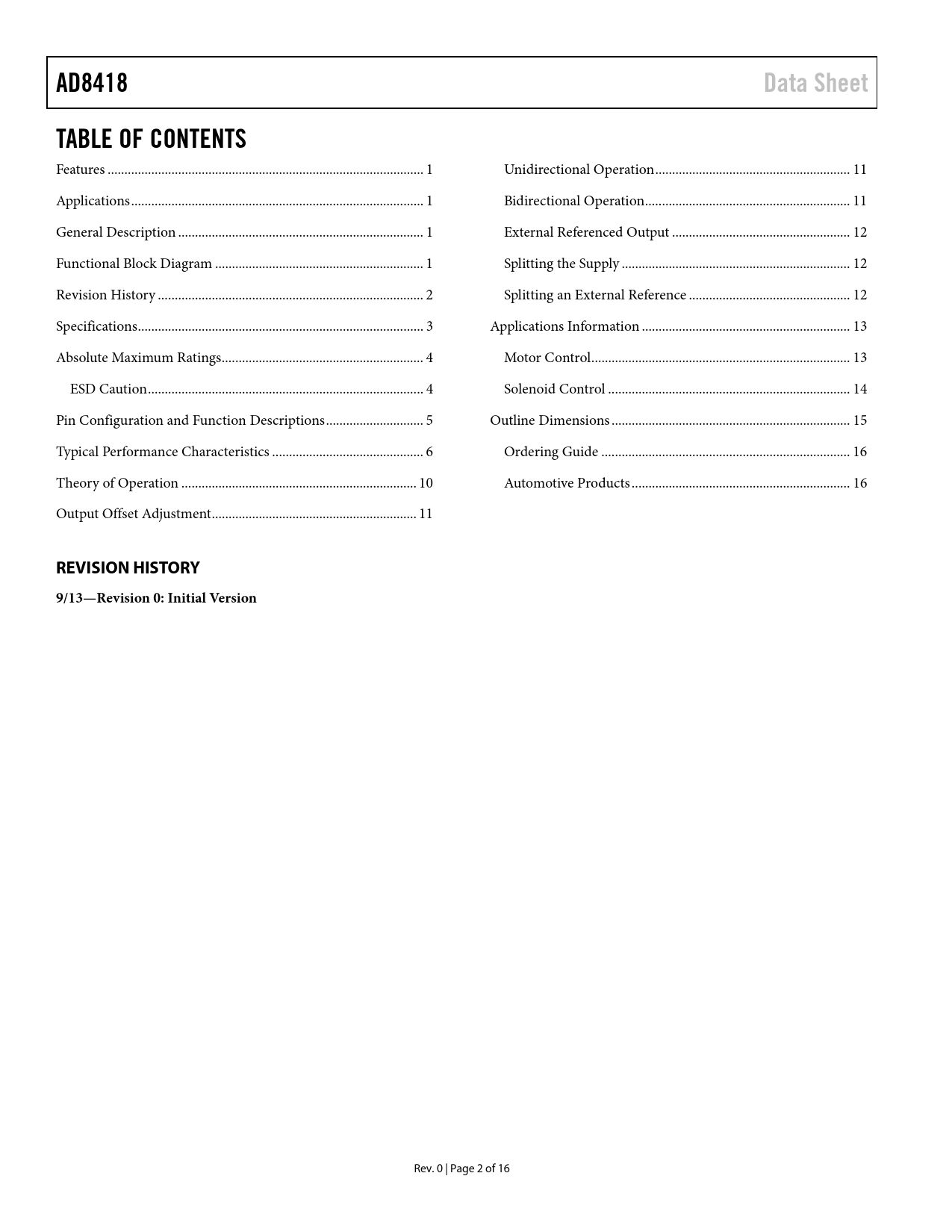Páginas / Página17 / 3 — AD8418. Data Sheet. TABLE OF CONTENTS. REVISION HISTORY. 9/13—Revision 0: …