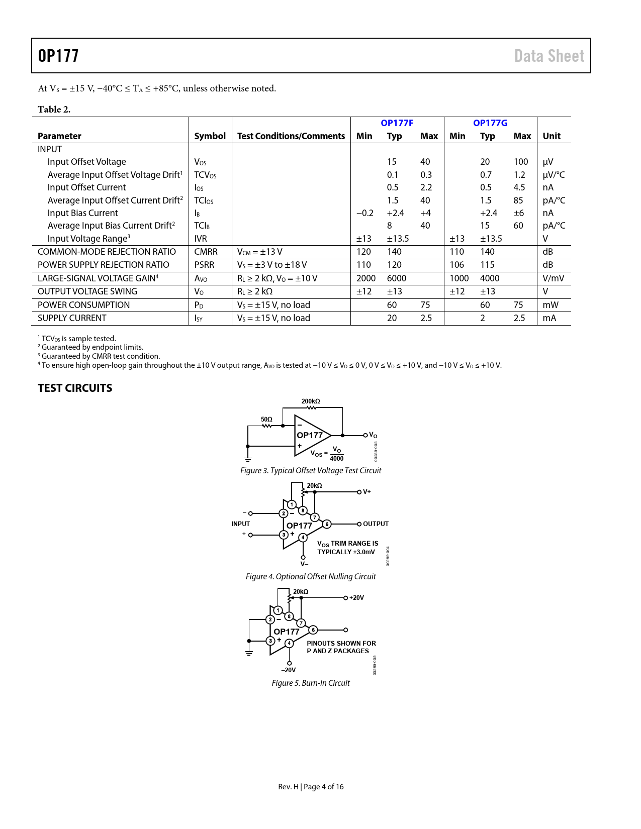 Table 2. OP177F OP177G Parameter Symbol Test Conditions/Comments Min Typ Max Min Typ Max Unit