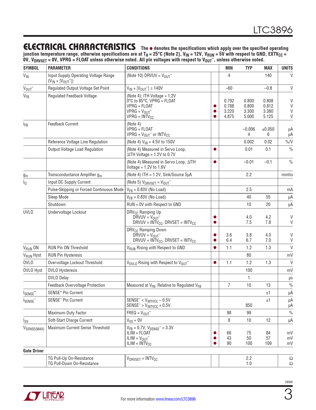 V – IN Input Supply Operating Voltage Range (Note 10) DRVUV = VOUT 4 140 V (V – IN + |VOUT |) V – – OUT Regulated Output Voltage Set Point VIN + |VOUT | ≤ 140V –60 –0.8 V VFB Regulated Feedback Voltage (Note 4); ITH Voltage = 1.2V 0°C to 85°C, VPRG = FLOAT 0.792 0.800 0.808 V VPRG = FLOAT l 0.788 0.800 0.812 V VPRG = V – OUT l 3.220 3.300 3.380 V VPRG = INTVCC l 4.875 5.000 5.125 V IFB Feedback Current (Note 4) VPRG = FLOAT –0.006 ±0.050 µA VPRG = V – OUT or INTVCC 4 6 µA Reference Voltage Line Regulation (Note 4) VIN = 4.5V to 150V 0.002 0.02 %/V Output Voltage Load Regulation (Note 4) Measured in Servo Loop, l 0.01 0.1 % ∆ITH Voltage = 1.2V to 0.7V (Note 4) Measured in Servo Loop, ∆ITH l –0.01 –0.1 % Voltage = 1.2V to 1.6V gm Transconductance Amplifier gm (Note 4) ITH = 1.2V, Sink/Source 5µA 2.2 mmho I – Q Input DC Supply Current (Note 5) VDRVSET = VOUT Pulse-Skipping or Forced Continuous Mode VFB = 0.83V (No Load) 2.5 mA Sleep Mode VFB = 0.83V (No Load) 40 55 µA Shutdown RUN = 0V with Respect to GND 10 20 µA UVLO Undervoltage Lockout DRVCC Ramping Up DRVUV = V – OUT l 4.0 4.2 V DRVUV = INTVCC, DRVSET = INTVCC l 7.5 7.8 V DRVCC Ramping Down DRVUV = V – OUT l 3.6 3.8 4.0 V DRVUV = INTVCC, DRVSET = INTVCC l 6.4 6.7 7.0 V VRUN ON RUN Pin ON Threshold VRUN Rising with Respect to GND l 1.1 1.2 1.3 V VRUN Hyst RUN Pin Hysteresis 80 mV OVLO Overvoltage Lockout Threshold V – OVLO Rising with Respect to VOUT l 1.1 1.2 1.3 V OVLO Hyst OVLO Hysteresis 100 mV OVLO Delay 1 µs Feedback Overvoltage Protection Measured at VFB, Relative to Regulated VFB 7 10 13 % I + SENSE SENSE+ Pin Current ±1 µA I – SENSE SENSE– Pin Current SENSE– < VINTVCC – 0.5V ±1 µA SENSE– > VINTVCC + 0.5V 850 µA Maximum Duty Factor FREQ = V – OUT 98 99 % ISS Soft-Start Charge Current VSS = 0V 8 10 12 µA V – SENSE(MAX) Maximum Current Sense Threshold VFB = 0.7V, VSENSE = 3.3V ILIM = FLOAT l 66 75 84 mV ILIM = V – OUT l 43 50 57 mV ILIM = INTVCC l 90 100 109 mV