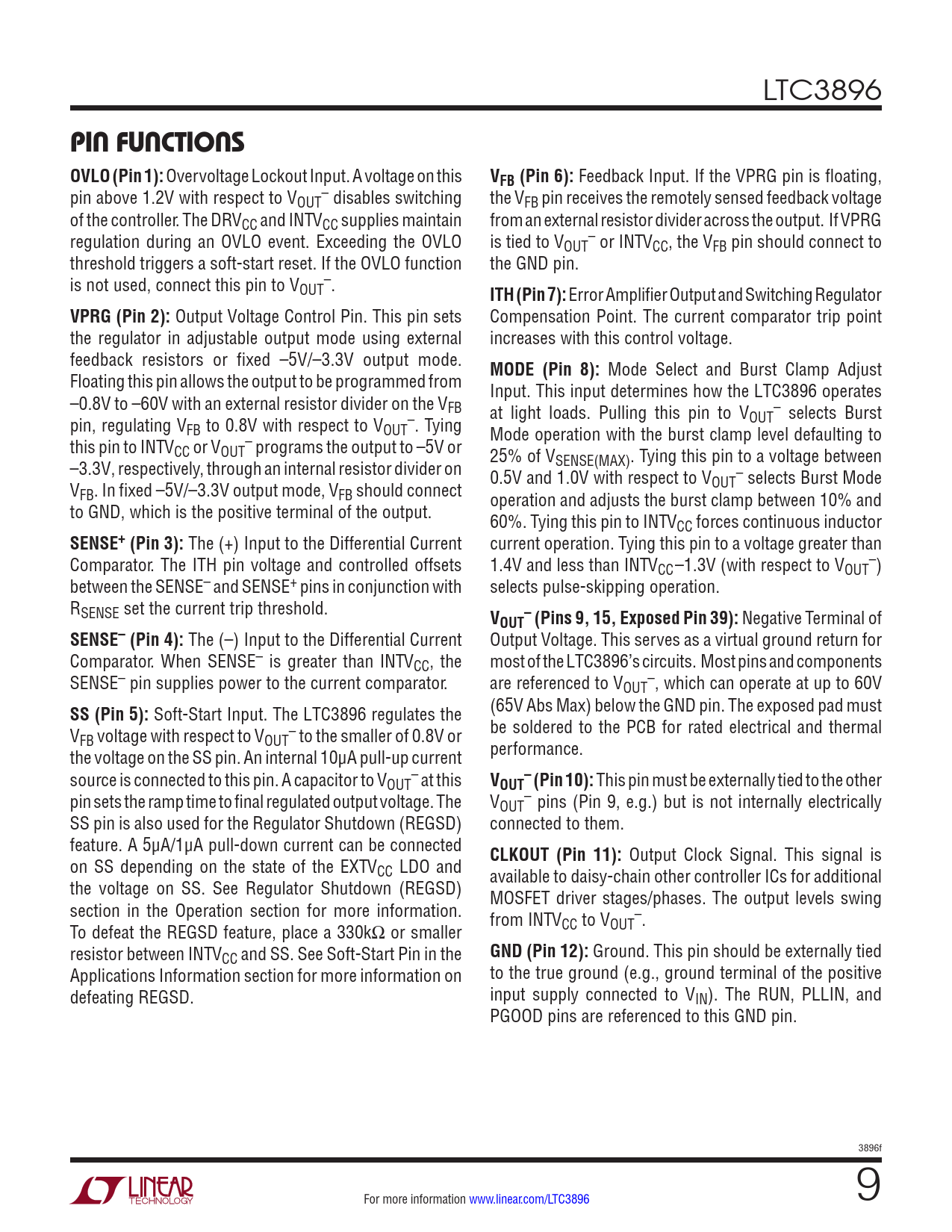link to page 16 LTC3896 pin FuncTions OVLO (Pin 1): Overvoltage Lockout Input. A voltage on this VFB (Pin 6): Feedback Input. If the VPRG pin is floating, pin above 1.2V with respect to V – OUT disables switching the VFB pin receives the remotely sensed feedback voltage of the controller. The DRVCC and INTVCC supplies maintain from an external resistor divider across the output. If VPRG regulation during an OVLO event. Exceeding the OVLO is tied to V – OUT or INTVCC, the VFB pin should connect to threshold triggers a soft-start reset. If the OVLO function the GND pin. is not used, connect this pin to V – OUT . ITH (Pin 7): Error Amplifier Output and Switching Regulator VPRG (Pin 2): Output Voltage Control Pin. This pin sets Compensation Point. The current comparator trip point the regulator in adjustable output mode using external increases with this control voltage. feedback resistors or fixed –5V/–3.3V output mode. MODE (Pin 8): Mode Select and Burst Clamp Adjust Floating this pin allows the output to be programmed from Input. This input determines how the LTC3896 operates –0.8V to –60V with an external resistor divider on the VFB at light loads. Pulling this pin to V – selects Burst pin, regulating V – OUT FB to 0.8V with respect to VOUT . Tying Mode operation with the burst clamp level defaulting to this pin to INTV – CC or VOUT programs the output to –5V or 25% of V –3.3V, respectively, through an internal resistor divider on SENSE(MAX). Tying this pin to a voltage between 0.5V and 1.0V with respect to V – selects Burst Mode V OUT FB. In fixed –5V/–3.3V output mode, VFB should connect operation and adjusts the burst clamp between 10% and to GND, which is the positive terminal of the output. 60%. Tying this pin to INTVCC forces continuous inductor SENSE+ (Pin 3): The (+) Input to the Differential Current current operation. Tying this pin to a voltage greater than Comparator. The ITH pin voltage and controlled offsets 1.4V and less than INTV – CC–1.3V (with respect to VOUT ) between the SENSE– and SENSE+ pins in conjunction with selects pulse-skipping operation. RSENSE set the current trip threshold. V–OUT (Pins 9, 15, Exposed Pin 39): Negative Terminal of SENSE– (Pin 4): The (–) Input to the Differential Current Output Voltage. This serves as a virtual ground return for Comparator. When SENSE– is greater than INTVCC, the most of the LTC3896’s circuits. Most pins and components SENSE– pin supplies power to the current comparator. are referenced to V – OUT , which can operate at up to 60V SS (Pin 5): Soft-Start Input. The LTC3896 regulates the (65V Abs Max) below the GND pin. The exposed pad must V – be soldered to the PCB for rated electrical and thermal FB voltage with respect to VOUT to the smaller of 0.8V or the voltage on the SS pin. An internal 10μA pull-up current performance. source is connected to this pin. A capacitor to V – – OUT at this VOUT (Pin 10): This pin must be externally tied to the other pin sets the ramp time to final regulated output voltage. The V – OUT pins (Pin 9, e.g.) but is not internally electrically SS pin is also used for the Regulator Shutdown (REGSD) connected to them. feature. A 5μA/1μA pull-down current can be connected CLKOUT (Pin 11): Output Clock Signal. This signal is on SS depending on the state of the EXTVCC LDO and available to daisy-chain other controller ICs for additional the voltage on SS. See Regulator Shutdown (REGSD) MOSFET driver stages/phases. The output levels swing section in the Operation section for more information. from INTV –. To defeat the REGSD feature, place a 330kΩ or smaller CC to VOUT resistor between INTVCC and SS. See Soft-Start Pin in the GND (Pin 12): Ground. This pin should be externally tied Applications Information section for more information on to the true ground (e.g., ground terminal of the positive defeating REGSD. input supply connected to VIN). The RUN, PLLIN, and PGOOD pins are referenced to this GND pin. 3896f For more information www.linear.com/LTC3896 9 Document Outline Features Applications Typical Application Description Absolute Maximum Ratings Order Information Pin Configuration Electrical Characteristics Typical Performance Characteristics Pin Functions Block Diagram Operation Applications Information Typical Applications Package Description Typical Application Related Parts