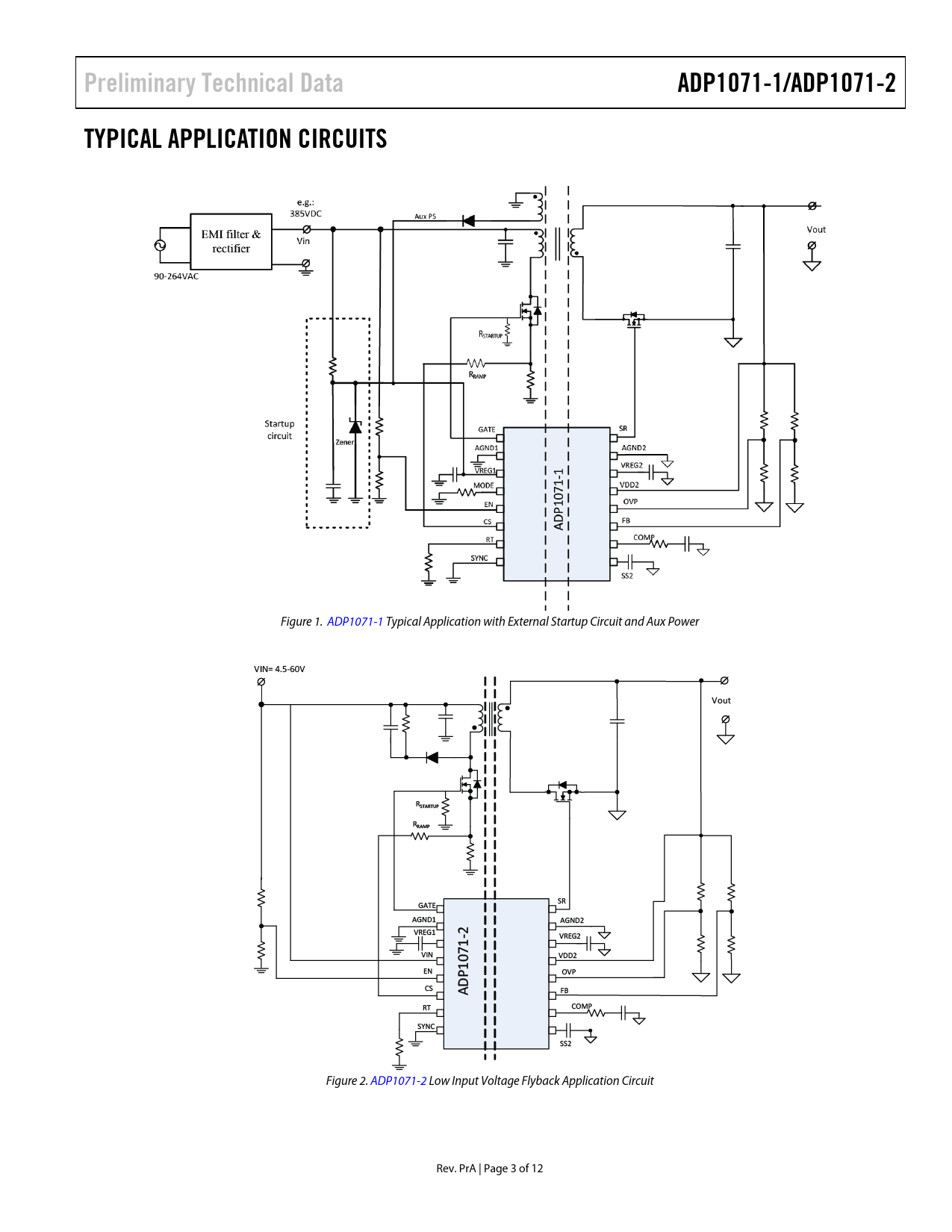 Preliminary Technical DataADP1071-1/ADP1071-2TYPICAL APPLICATION CIRCUITS Figure 1. ADP1071-1 Typical Application with External Startup Circuit and Aux Power Figure 2. ADP1071-2 Low Input Voltage Flyback Application Circuit Rev. PrA | Page 3 of 12 Document Outline FEATURES APPLICATIONS GENERAL DESCRIPTION TABLE OF CONTENTS TYPICAL APPLICATION CIRCUITS SPECIFICATIONS REGULATORY INFORMATION ABSOLUTE MAXIMUM RATINGS THERMAL RESISTANCE ESD CAUTION PIN CONFIGURATIONS AND FUNCTION DESCRIPTIONS SIMPLIFIED BLOCK DIAGRAM APPLICATIONS INFORMATION INSULATION LIFETIME OUTLINE DIMENSIONS