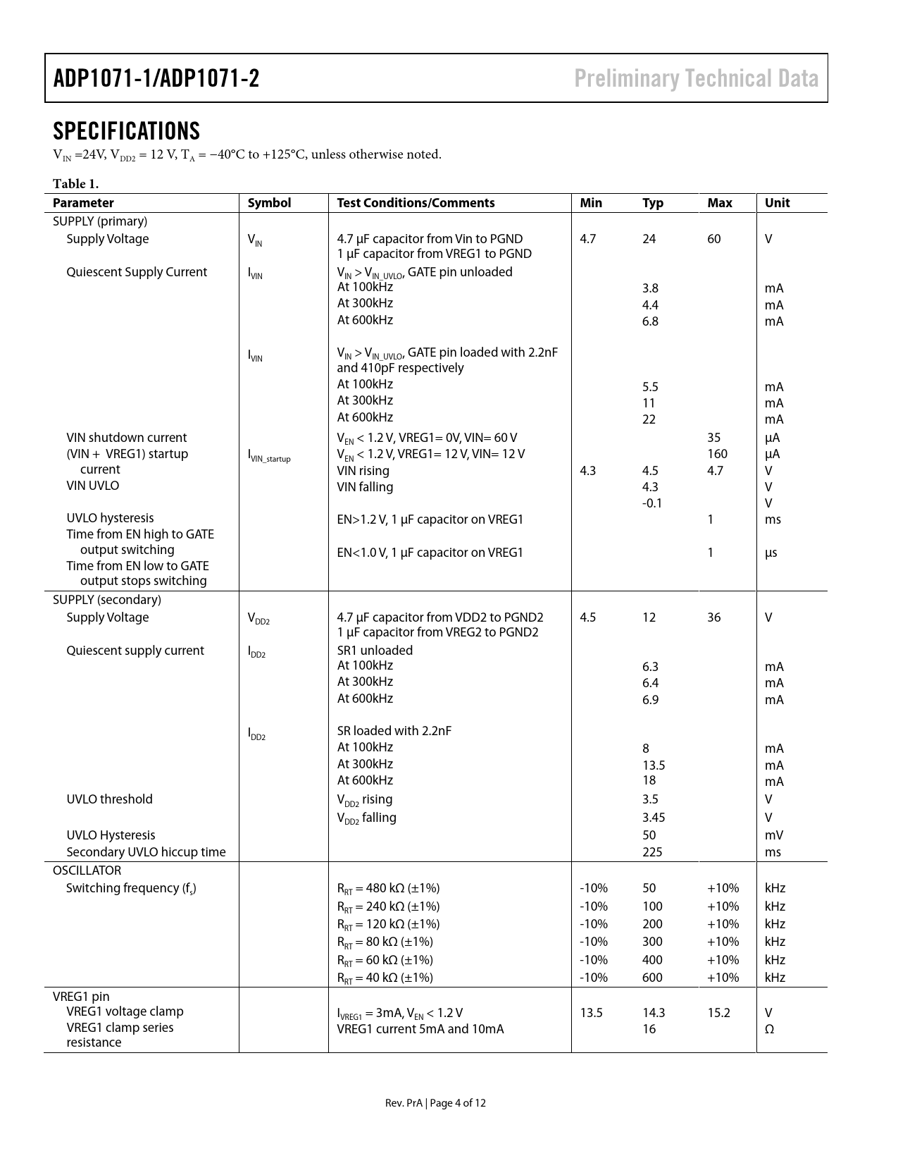 Páginas / Página12 / 4 — ADP1071-1/ADP1071-2. Preliminary Technical Data. SPECIFICATIONS. Table 1. …