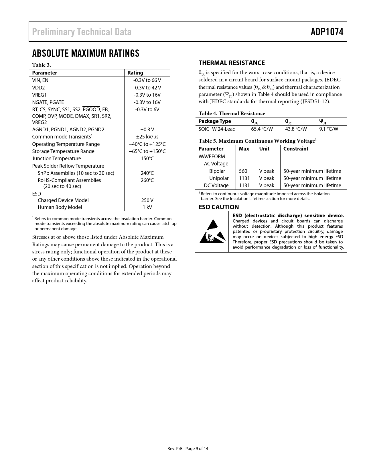 link to page 9 link to page 13 Preliminary Technical DataADP1074ABSOLUTE MAXIMUM RATINGS Table 3.THERMAL RESISTANCEParameterRating θJA is specified for the worst-case conditions, that is, a device VIN, EN -0.3V to 66 V soldered in a circuit board for surface-mount packages. JEDEC VDD2 -0.3V to 42 V thermal resistance values (θJA & θJC) and thermal characterization VREG1 -0.3V to 16V parameter (ΨJT) shown in Table 4 should be used in compliance NGATE, PGATE -0.3V to 16V with JEDEC standards for thermal reporting (JESD51-12). RT, CS, SYNC, SS1, SS2, PGOOD, FB, -0.3V to 6V COMP, OVP, MODE, DMAX, SR1, SR2, Table 4. Thermal Resistance VREG2 Package TypeθθΨJAJCJT AGND1, PGND1, AGND2, PGND2 ±0.3 V SOIC_W 24-Lead 65.4 °C/W 43.8 °C/W 9.1 °C/W Common mode Transients1 ±25 kV/µs Operating Temperature Range −40°C to +125°C Table 5. Maximum Continuous Working Voltage1 Storage Temperature Range −65°C to +150°C ParameterMaxUnitConstraint Junction Temperature 150°C WAVEFORM Peak Solder Reflow Temperature AC Voltage SnPb Assemblies (10 sec to 30 sec) 240°C Bipolar 560 V peak 50-year minimum lifetime RoHS-Compliant Assemblies 260°C Unipolar 1131 V peak 50-year minimum lifetime (20 sec to 40 sec) DC Voltage 1131 V peak 50-year minimum lifetime ESD 1 Refers to continuous voltage magnitude imposed across the isolation Charged Device Model 250 V barrier. See the Insulation Lifetime section for more details. Human Body Model 1 kV ESD CAUTION 1 Refers to common mode transients across the insulation barrier. Common mode transients exceeding the absolute maximum rating can cause latch up or permanent damage. Stresses at or above those listed under Absolute Maximum Ratings may cause permanent damage to the product. This is a stress rating only; functional operation of the product at these or any other conditions above those indicated in the operational section of this specification is not implied. Operation beyond the maximum operating conditions for extended periods may affect product reliability. Rev. PrB | Page 9 of 14 Document Outline FEATURES APPLICATIONS GENERAL DESCRIPTION TABLE OF CONTENTS TYPICAL APPLICATION CIRCUITS SPECIFICATIONS REGULATORY INFORMATION ABSOLUTE MAXIMUM RATINGS THERMAL RESISTANCE ESD CAUTION PIN CONFIGURATION AND FUNCTION DESCRIPTIONS SIMPLIFIED BLOCK DIAGRAM APPLICATIONS INFORMATION INSULATION LIFETIME OUTLINE DIMENSIONS