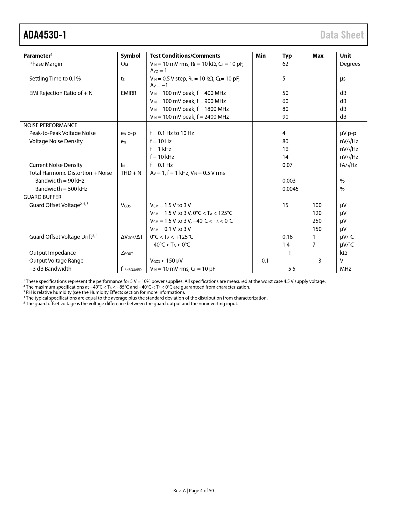 link to page 37 ADA4530-1Data SheetParameter1SymbolTest Conditions/CommentsMinTypMaxUnit Phase Margin ΦM VIN = 10 mV rms, RL = 10 kΩ, CL = 10 pF, 62 Degrees AVO = 1 Settling Time to 0.1% tS VIN = 0.5 V step, RL = 10 kΩ, CL= 10 pF, 5 μs AV = −1 EMI Rejection Ratio of +IN EMIRR VIN = 100 mV peak, f = 400 MHz 50 dB VIN = 100 mV peak, f = 900 MHz 60 dB VIN = 100 mV peak, f = 1800 MHz 80 dB VIN = 100 mV peak, f = 2400 MHz 90 dB NOISE PERFORMANCE Peak-to-Peak Voltage Noise eN p-p f = 0.1 Hz to 10 Hz 4 μV p-p Voltage Noise Density eN f = 10 Hz 80 nV/√Hz f = 1 kHz 16 nV/√Hz f = 10 kHz 14 nV/√Hz Current Noise Density IN f = 0.1 Hz 0.07 fA/√Hz Total Harmonic Distortion + Noise THD + N AV = 1, f = 1 kHz, VIN = 0.5 V rms Bandwidth = 90 kHz 0.003 % Bandwidth = 500 kHz 0.0045 % GUARD BUFFER Guard Offset Voltage2, 4, 5 VGOS VCM = 1.5 V to 3 V 15 100 μV VCM = 1.5 V to 3 V, 0°C < TA < 125°C 120 μV VCM = 1.5 V to 3 V, −40°C < TA < 0°C 250 μV VCM = 0.1 V to 3 V 150 μV Guard Offset Voltage Drift2, 4 ΔVGOS/ΔT 0°C < TA < +125°C 0.18 1 μV/°C −40°C < TA < 0°C 1.4 7 μV/°C Output Impedance ZGOUT 1 kΩ Output Voltage Range VGOS < 150 μV 0.1 3 V −3 dB Bandwidth f−3dBGUARD VIN = 10 mV rms, CL = 10 pF 5.5 MHz 1 These specifications represent the performance for 5 V ± 10% power supplies. All specifications are measured at the worst case 4.5 V supply voltage. 2 The maximum specifications at −40°C < TA < +85°C and −40°C < TA < 0°C are guaranteed from characterization. 3 RH is relative humidity (see the Humidity Effects section for more information). 4 The typical specifications are equal to the average plus the standard deviation of the distribution from characterization. 5 The guard offset voltage is the voltage difference between the guard output and the noninverting input. Rev. A | Page 4 of 50 Document Outline FEATURES APPLICATIONS PIN CONNECTION DIAGRAM GENERAL DESCRIPTION TABLE OF CONTENTS REVISION HISTORY SPECIFICATIONS 5 V NOMINAL ELECTRICAL CHARACTERISTICS 10 V NOMINAL ELECTRICAL CHARACTERISTICS 15 V NOMINAL ELECTRICAL CHARACTERISTICS ABSOLUTE MAXIMUM RATINGS THERMAL RESISTANCE ESD CAUTION PIN CONFIGURATION AND FUNCTION DESCRIPTIONS TYPICAL PERFORMANCE CHARACTERISTICS MAIN AMPLIFIER, DC PERFORMANCE MAIN AMPLIFIER, AC PERFORMANCE GUARD AMPLIFIER THEORY OF OPERATION ESD STRUCTURE INPUT STAGE GAIN STAGE OUTPUT STAGE GUARD BUFFER APPLICATIONS INFORMATION INPUT PROTECTION SINGLE-SUPPLY AND RAIL-TO-RAIL OUTPUT CAPACITIVE LOAD STABILITY EMI REJECTION RATIO HIGH IMPEDANCE MEASUREMENTS INPUT BIAS CURRENT INPUT RESISTANCE INPUT OFFSET VOLTAGE INSULATION RESISTANCE GUARDING DIELECTRIC RELAXATION HUMIDITY EFFECTS CONTAMINATION CLEANING AND HANDLING SOLDER PASTE SELECTION CURRENT NOISE CONSIDERATIONS LAYOUT GUIDELINES PHYSICAL IMPLEMENTATION OF GUARDING TECHNIQUES GUARD RING GUARD PLANE VIA FENCE CABLES AND CONNECTORS ELECTROSTATIC INTERFERANCE PHOTODIODE INTERFACE DC ERROR ANALYSIS AC ERROR ANALYSIS NOISE ANALYSIS DESIGN RECOMMENDATIONS DESIGN EXAMPLE POWER SUPPLY RECOMMENDATIONS POWER SUPPLY CONSIDERATIONS OUTLINE DIMENSIONS ORDERING GUIDE