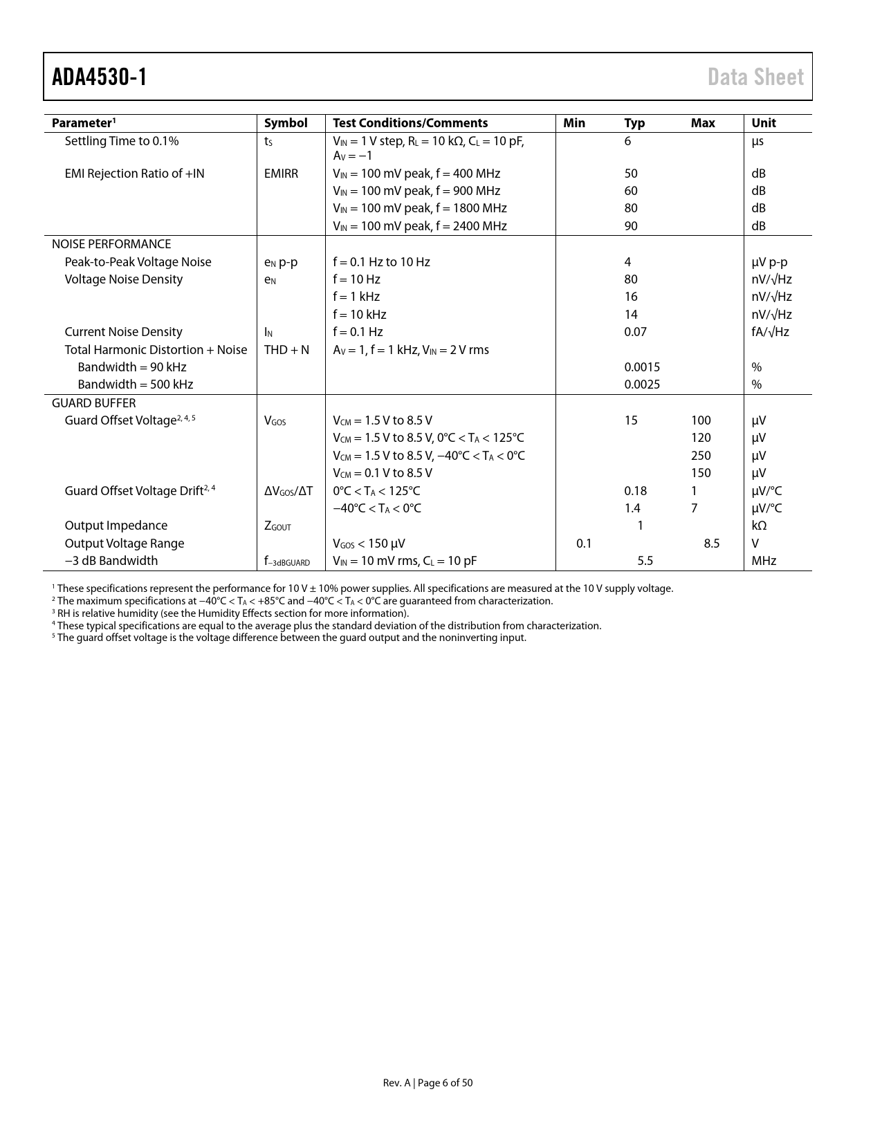 ADA4530-1. Data Sheet. Parameter1. Symbol. Test Conditions/Comments. Min. Typ. Max. Unit