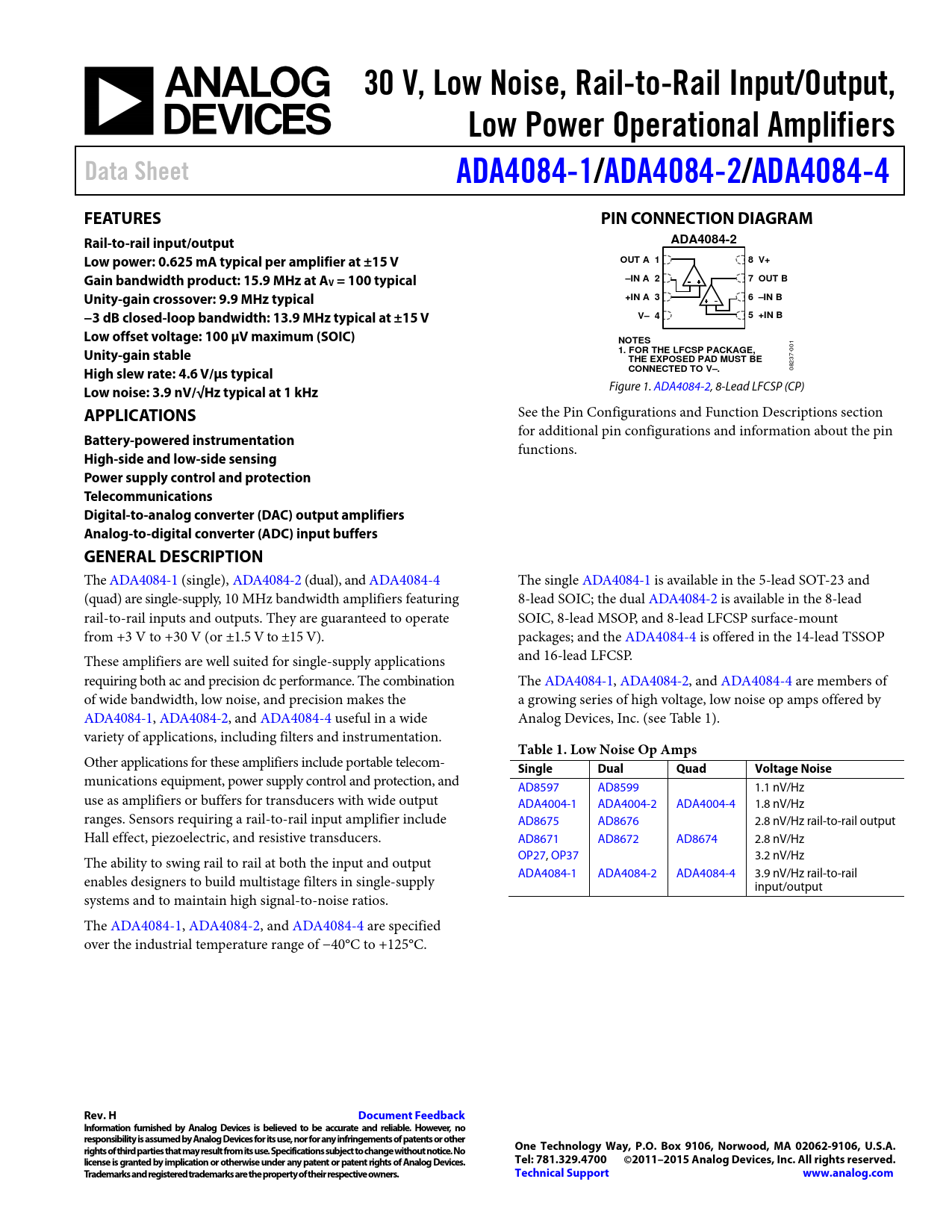 30 V, Low Noise, Rail-to-Rail Input/Output,. Low Power Operational Amplifiers. Data Sheet. ADA4084-1/. ADA4084-2/. ADA4084-4