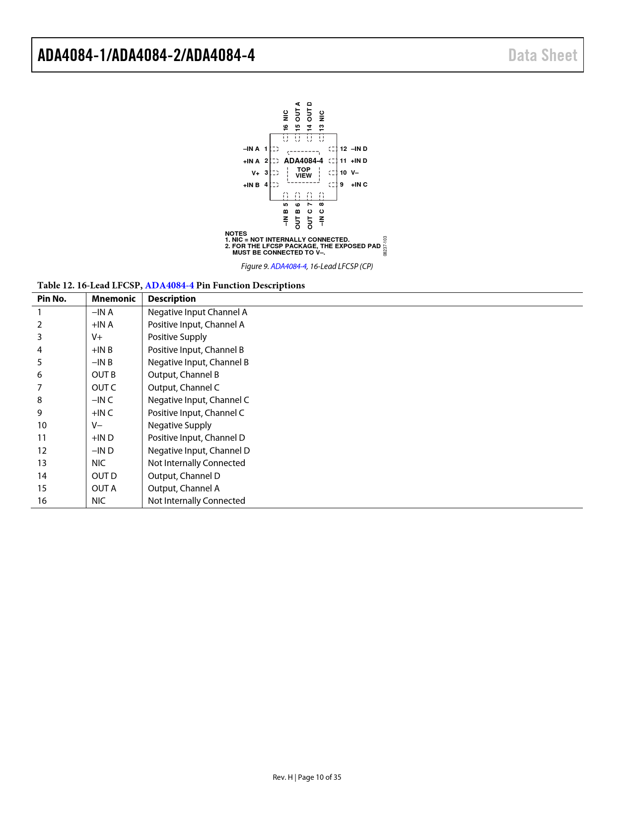 Table 12. 16-Lead LFCSP, ADA4084-4 Pin Function Descriptions Pin No. Mnemonic Description
