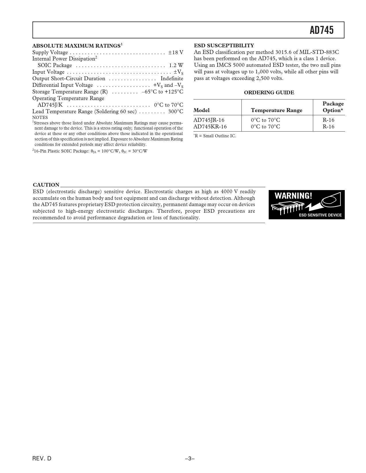 AD745. ABSOLUTE MAXIMUM RATINGS1. ESD SUSCEPTIBILITY. ORDERING GUIDE. Package. Model. Temperature Range. Option*. CAUTION. WARNING!