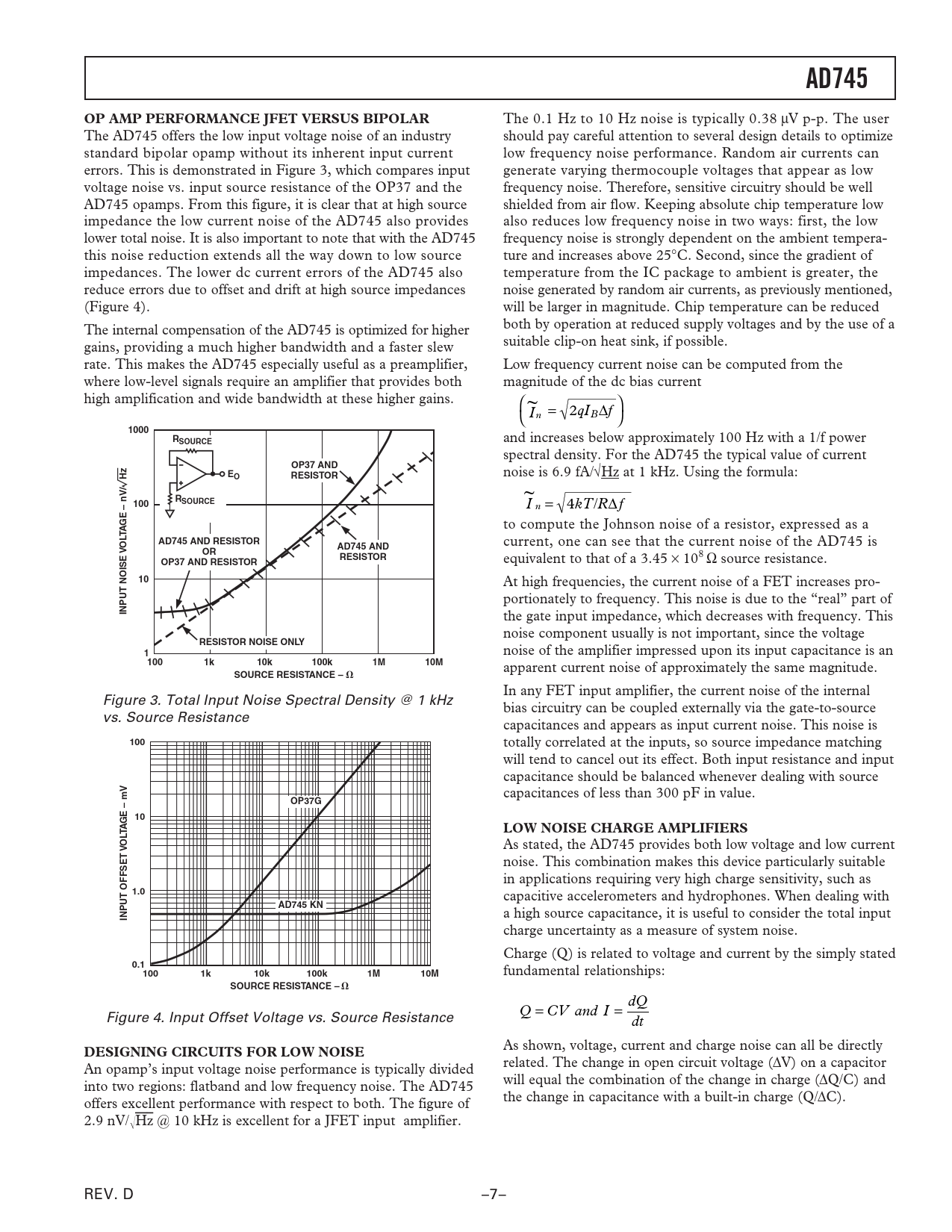 related. The change in open circuit voltage (∆V) on a capacitor An opamp’s input voltage noise performance is typically divided will equal the combination of the change in charge (∆Q/C) and into two regions: flatband and low frequency noise. The AD745 the change in capacitance with a built-in charge (Q/∆C). offers excellent performance with respect to both. The figure of 2.9 nV/冑Hz @ 10 kHz is excellent for a JFET input amplifier. REV. D –7–