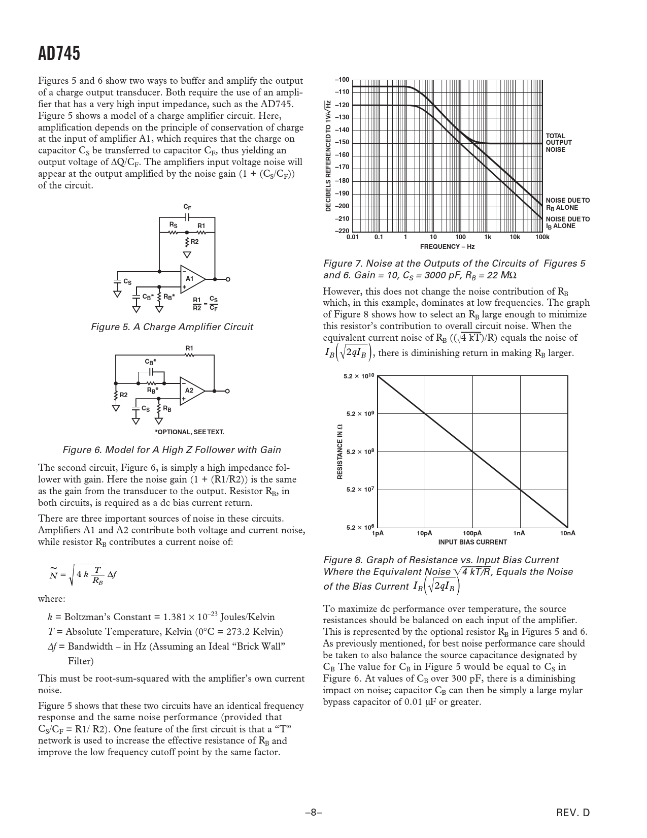 AD745 Figures 5 and 6 show two ways to buffer and amplify the output –100 of a charge output transducer. Both require the use of an ampli- –110 fier that has a very high input impedance, such as the AD745. –120 Figure 5 shows a model of a charge amplifier circuit. Here, –1301V/ Hz amplification depends on the principle of conservation of charge O T –140 at the input of amplifier A1, which requires that the charge on TOTAL–150OUTPUT capacitor C NOISE S be transferred to capacitor CF, thus yielding an –160 output voltage of ∆Q/CF. The amplifiers input voltage noise will –170 appear at the output amplified by the noise gain (1 + (CS/CF)) of the circuit. –180–190NOISE DUE TOCF–200DECIBELS REFERENCEDRB ALONE–210NOISE DUE TORSR1IB ALONE–2200.010.11101001k10k100kR2FREQUENCY – Hz Figure 7. Noise at the Outputs of the Circuits of Figures 5 and 6. Gain = 10, C A1 S = 3000 pF, RB = 22 MΩ CS However, this does not change the noise contribution of R C B B*RB*R1CS= which, in this example, dominates at low frequencies. The graph R2CF of Figure 8 shows how to select an RB large enough to minimize Figure 5. A Charge Amplifier Circuit this resistor’s contribution to overall circuit noise. When the equivalent current noise of RB ((冑4 kT)/R) equals the noise of R1 I 2qI ( ) B B , there is diminishing return in making RB larger. CB*5.21010RB*A2R2CRSB5.2109*OPTIONAL, SEE TEXT. Figure 6. Model for A High Z Follower with Gain 5.2108ANCE IN The second circuit, Figure 6, is simply a high impedance fol- lower with gain. Here the noise gain (1 + (R1/R2)) is the same RESIST as the gain from the transducer to the output. Resistor R 5.2107 B, in both circuits, is required as a dc bias current return. There are three important sources of noise in these circuits. Amplifiers A1 and A2 contribute both voltage and current noise, 5.21061pA10pA100pA1nA10nA while resistor RB contributes a current noise of: INPUT BIAS CURRENT Figure 8. Graph of Resistance vs. Input Bias Current ~ T Where the Equivalent Noise 兹4 kT/R, Equals the Noise N = 4 k f ∆ R B of the Bias Current I 2qI ( ) B B where: To maximize dc performance over temperature, the source k = Boltzman’s Constant = 1.381 × 10–23 Joules/Kelvin resistances should be balanced on each input of the amplifier. T = Absolute Temperature, Kelvin (0°C = 273.2 Kelvin) This is represented by the optional resistor RB in Figures 5 and 6. ∆f = Bandwidth – in Hz (Assuming an Ideal “Brick Wall” As previously mentioned, for best noise performance care should be taken to also balance the source capacitance designated by Filter) CB The value for CB in Figure 5 would be equal to CS in This must be root-sum-squared with the amplifier’s own current Figure 6. At values of CB over 300 pF, there is a diminishing noise. impact on noise; capacitor CB can then be simply a large mylar Figure 5 shows that these two circuits have an identical frequency bypass capacitor of 0.01 µF or greater. response and the same noise performance (provided that CS/CF = R1/ R2). One feature of the first circuit is that a “T” network is used to increase the effective resistance of RB and improve the low frequency cutoff point by the same factor. –8– REV. D
