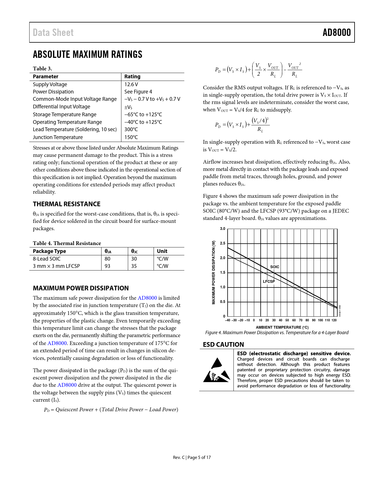Data Sheet AD8000 ABSOLUTE MAXIMUM RATINGS Table 3 Parameter Rating THERMAL RESISTANCE 3.0 Table 4 Thermal Resistance 2.5 W (