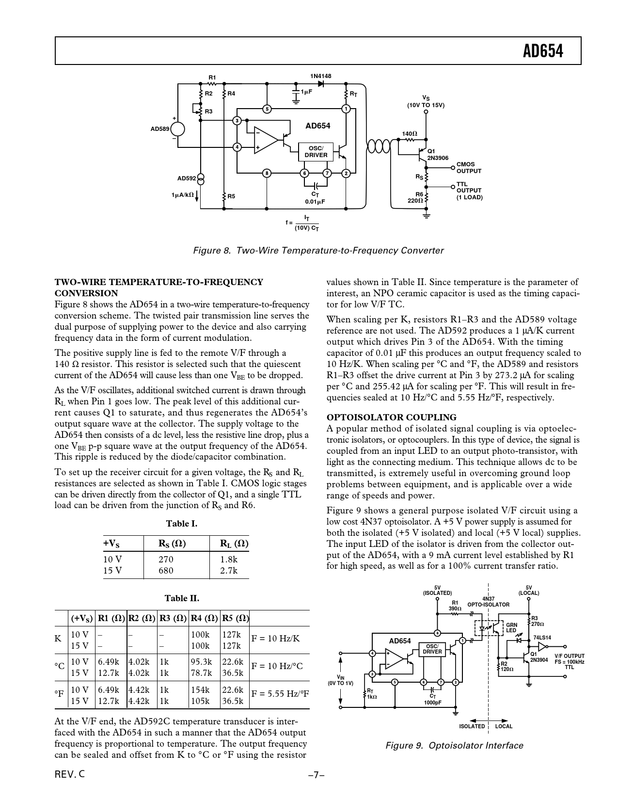 AD6541N4148R11 m FR2R4RTVS(10V TO 15V)R3+AD654AD589140 V –OSC/Q1DRIVER2N3906CMOS OUTPUTAD592RSTTL OUTPUT1C m A/k V R5TR6(1 LOAD)0.01 m F220 V ITf = (10V) CT Figure 8. Two-Wire Temperature-to-Frequency Converter TWO-WIRE TEMPERATURE-TO-FREQUENCY values shown in Table II. Since temperature is the parameter of CONVERSION interest, an NPO ceramic capacitor is used as the timing capaci- Figure 8 shows the AD654 in a two-wire temperature-to-frequency tor for low V/F TC. conversion scheme. The twisted pair transmission line serves the When scaling per K, resistors R1–R3 and the AD589 voltage dual purpose of supplying power to the device and also carrying reference are not used. The AD592 produces a 1 µA/K current frequency data in the form of current modulation. output which drives Pin 3 of the AD654. With the timing The positive supply line is fed to the remote V/F through a capacitor of 0.01 µF this produces an output frequency scaled to 140 Ω resistor. This resistor is selected such that the quiescent 10 Hz/K. When scaling per °C and °F, the AD589 and resistors current of the AD654 will cause less than one VBE to be dropped. R1–R3 offset the drive current at Pin 3 by 273.2 µA for scaling As the V/F oscillates, additional switched current is drawn through per °C and 255.42 µA for scaling per °F. This will result in fre- R quencies sealed at 10 Hz/°C and 5.55 Hz/°F, respectively. L when Pin 1 goes low. The peak level of this additional cur- rent causes Q1 to saturate, and thus regenerates the AD654’s OPTOISOLATOR COUPLING output square wave at the collector. The supply voltage to the A popular method of isolated signal coupling is via optoelec- AD654 then consists of a dc level, less the resistive line drop, plus a tronic isolators, or optocouplers. In this type of device, the signal is one VBE p-p square wave at the output frequency of the AD654. coupled from an input LED to an output photo-transistor, with This ripple is reduced by the diode/capacitor combination. light as the connecting medium. This technique allows dc to be To set up the receiver circuit for a given voltage, the RS and RL transmitted, is extremely useful in overcoming ground loop resistances are selected as shown in Table I. CMOS logic stages problems between equipment, and is applicable over a wide can be driven directly from the collector of Q1, and a single TTL range of speeds and power. load can be driven from the junction of RS and R6. Figure 9 shows a general purpose isolated V/F circuit using a Table I. low cost 4N37 optoisolator. A +5 V power supply is assumed for both the isolated (+5 V isolated) and local (+5 V local) supplies. +VSRS ( ⍀ )RL ( ⍀ ) The input LED of the isolator is driven from the collector out- put of the AD654, with a 9 mA current level established by R1 10 V 270 1.8k for high speed, as well as for a 100% current transfer ratio. 15 V 680 2.7k 5V5V(ISOLATED)(LOCAL)Table II.4N37R1OPTO-ISOLATOR390 V (+VS) R1 ( ⍀ ) R2 ( ⍀ ) R3 ( ⍀ ) R4 ( ⍀ ) R5 ( ⍀ )R3GRN270 V LED 10 V – – – 100k 127k K F = 10 Hz/K 74LS14AD654 15 V – – – 100k 127k OSC/DRIVERQ1V/F OUTPUT ° 10 V 6.49k 4.02k 1k 95.3k 22.6k 2N3904FS = 100kHz C F = 10 Hz/°C R2TTL 15 V 12.7k 4.02k 1k 78.7k 36.5k 120 V VIN(0V TO 1V) ° 10 V 6.49k 4.42k 1k 154k 22.6k F F = 5.55 Hz/°F RT 1k V C 15 V 12.7k 4.42k 1k 105k 36.5k T1000pF At the V/F end, the AD592C temperature transducer is inter- ISOLATEDLOCAL faced with the AD654 in such a manner that the AD654 output frequency is proportional to temperature. The output frequency Figure 9. Optoisolator Interface can be sealed and offset from K to °C or °F using the resistor REV. C –7–
