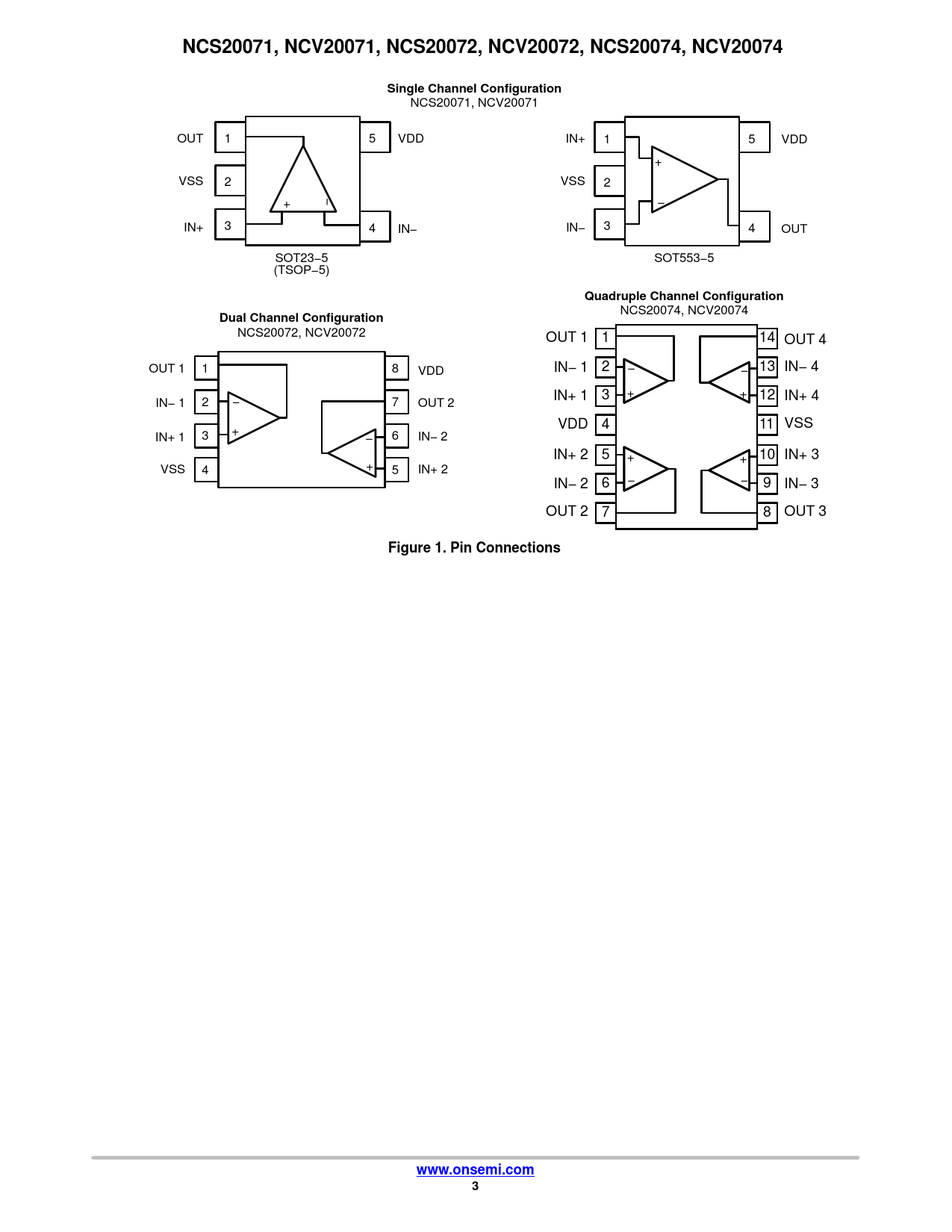NCS20071, NCV20071, NCS20072, NCV20072, NCS20074, NCV20074. Single Channel Configuration. Quadruple Channel Configuration