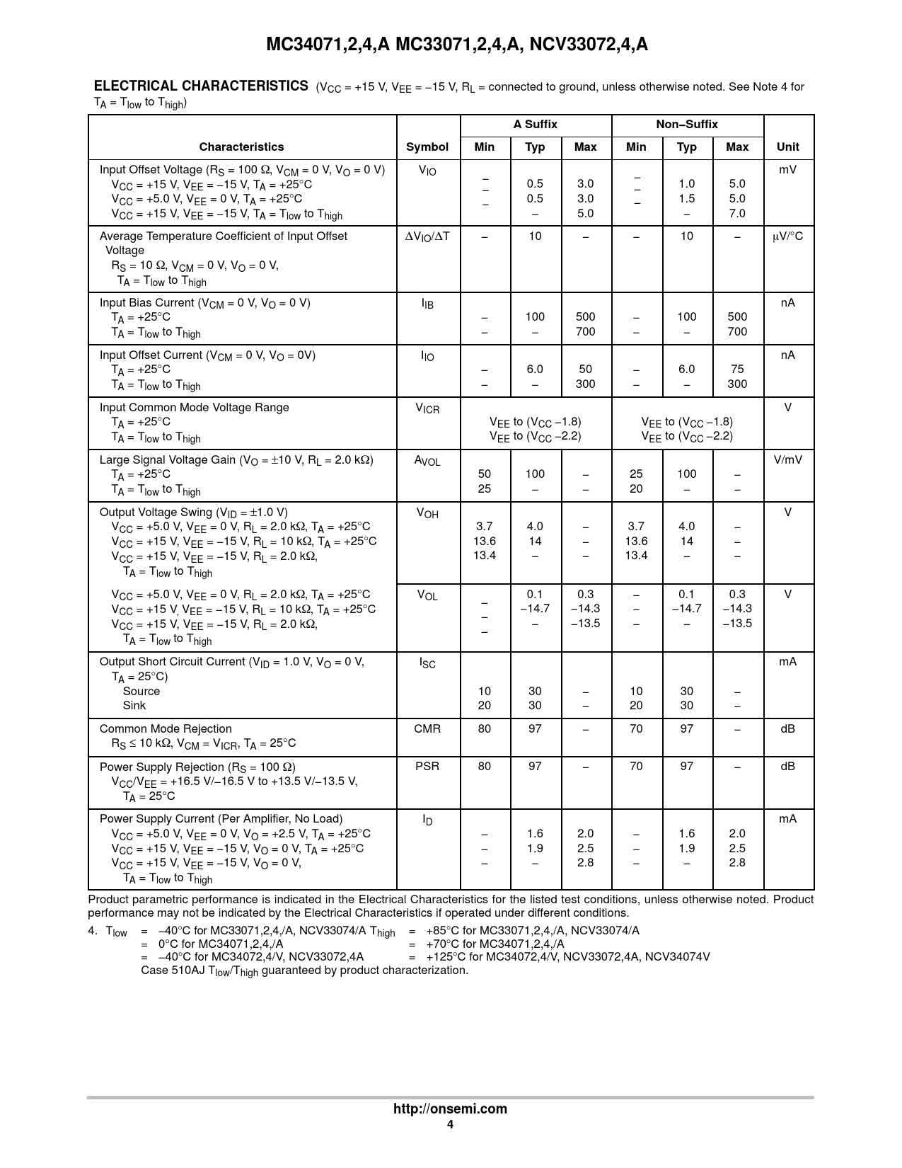 MC34071,2,4,A MC33071,2,4,A, NCV33072,4,A. ELECTRICAL CHARACTERISTICS. A Suffix. Non−Suffix. Characteristics. Symbol. Min. Typ. Max. Unit