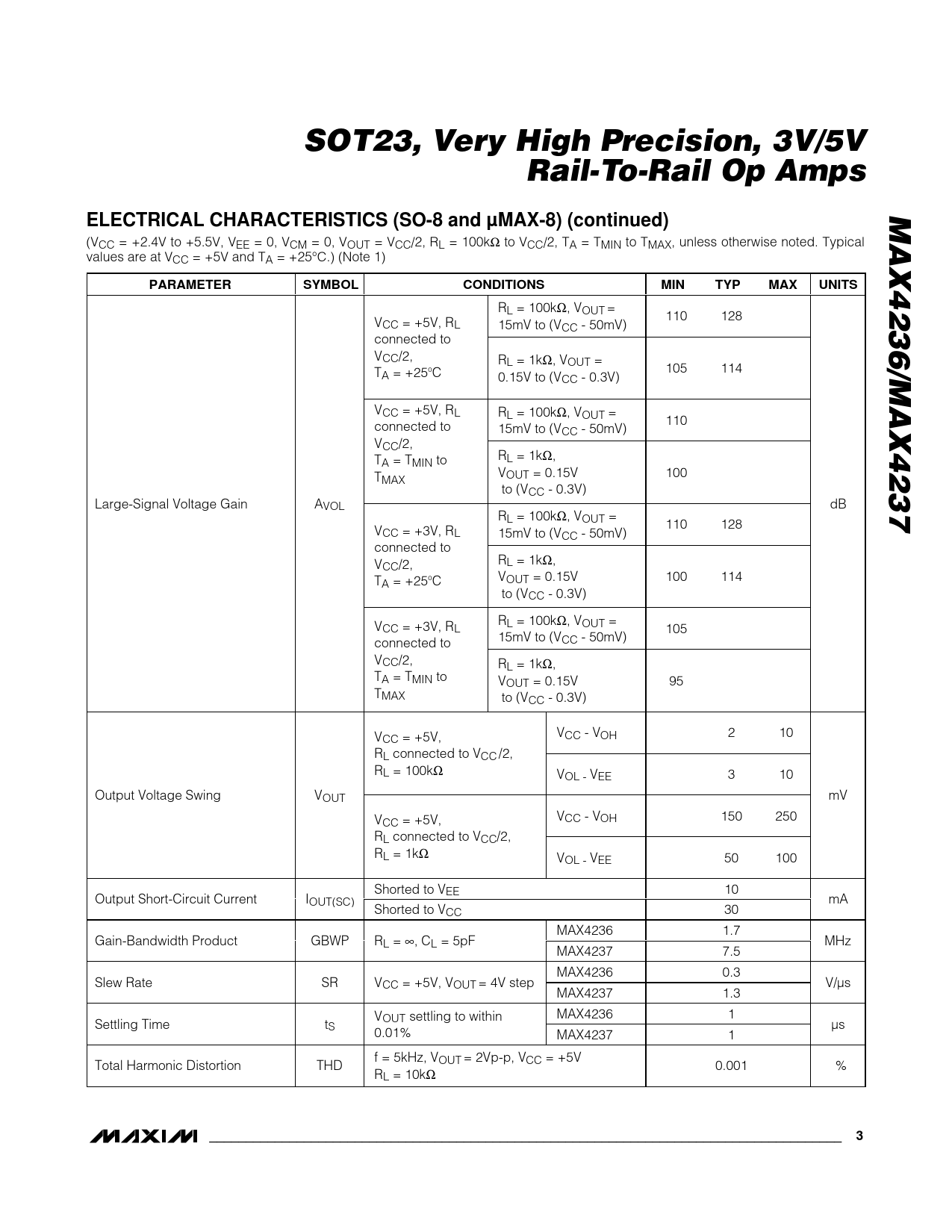 SOT23, Very High Precision, 3V/5VRail-To-Rail Op AmpsMAX4236/MAX4237ELECTRICAL CHARACTERISTICS (SO-8 and µMAX-8) (continued) (VCC = +2.4V to +5.5V, VEE = 0, VCM = 0, VOUT = VCC/2, RL = 100kΩ to VCC/2, TA = TMIN to TMAX, unless otherwise noted. Typical values are at VCC = +5V and TA = +25°C.) (Note 1) PARAMETERSYMBOLCONDITIONSMINTYPMAXUNITS RL = 100kΩ, VOUT = 110 128 VCC = +5V, RL 15mV to (VCC - 50mV) connected to VCC/2, RL = 1kΩ, VOUT = T 105 114 A = +25oC 0.15V to (VCC - 0.3V) VCC = +5V, RL RL = 100kΩ, VOUT = 110 connected to 15mV to (VCC - 50mV) VCC/2, T R A = TMIN to L = 1kΩ, T V 100 MAX OUT = 0.15V to (VCC - 0.3V) Large-Signal Voltage Gain AVOL dB RL = 100kΩ, VOUT = 110 128 VCC = +3V, RL 15mV to (VCC - 50mV) connected to V R CC/2, L = 1kΩ, T V 100 114 A = +25oC OUT = 0.15V to (VCC - 0.3V) RL = 100kΩ, VOUT = VCC = +3V, RL 105 15mV to (VCC - 50mV) connected to VCC/2, RL = 1kΩ, TA = TMIN to VOUT = 0.15V 95 TMAX to (VCC - 0.3V) VCC - VOH 2 10 VCC = +5V, RL connected to VCC /2, RL = 100kΩ VOL - VEE 3 10 Output Voltage Swing VOUT mV VCC - VOH 150 250 VCC = +5V, RL connected to VCC/2, RL = 1kΩ VOL - VEE 50 100 Shorted to VEE 10 Output Short-Circuit Current IOUT(SC) mA Shorted to VCC 30 MAX4236 1.7 Gain-Bandwidth Product GBWP RL = ∞, CL = 5pF MHz MAX4237 7.5 MAX4236 0.3 Slew Rate SR VCC = +5V, VOUT = 4V step V/µs MAX4237 1.3 V settling to within MAX4236 1 Settling Time t OUT S µs 0.01% MAX4237 1 f = 5kHz, V = 2Vp-p, V Total Harmonic Distortion THD OUT CC = +5V RL = 10kΩ 0.001 % _______________________________________________________________________________________3