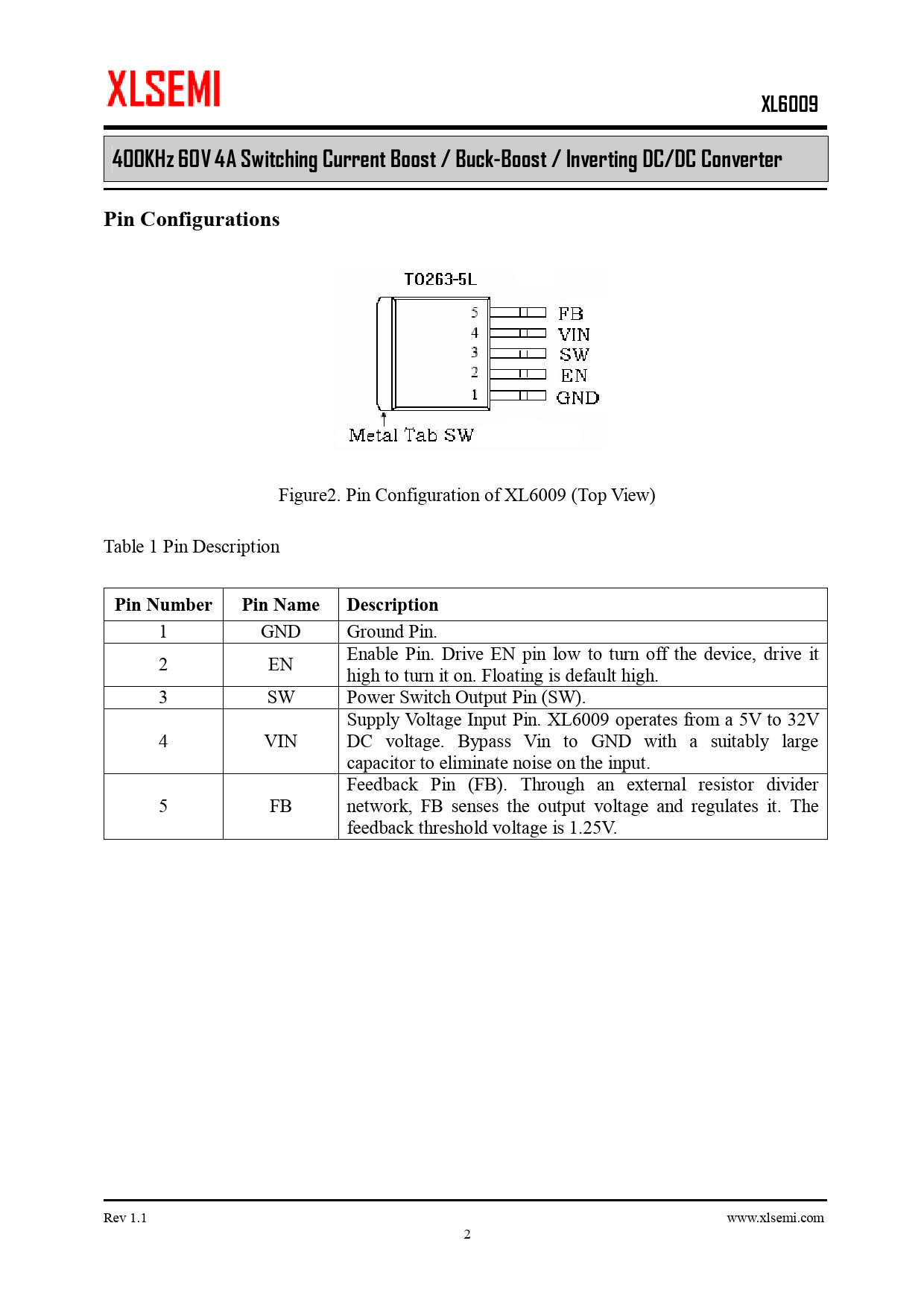 1 GND Ground Pin. Enable Pin. Drive EN pin low to turn off the device, drive it 2 EN high to turn it on. Floating is default high. 3 SW Power Switch Output Pin (SW). Supply Voltage Input Pin. XL6009 operates from a 5V to 32V 4 VIN DC voltage. Bypass Vin to GND with a suitably large capacitor to eliminate noise on the input. Feedback Pin (FB). Through an external resistor divider 5 FB network, FB senses the output voltage and regulates it. The feedback threshold voltage is 1.25V. Rev 1.1 www.xlsemi.com 2