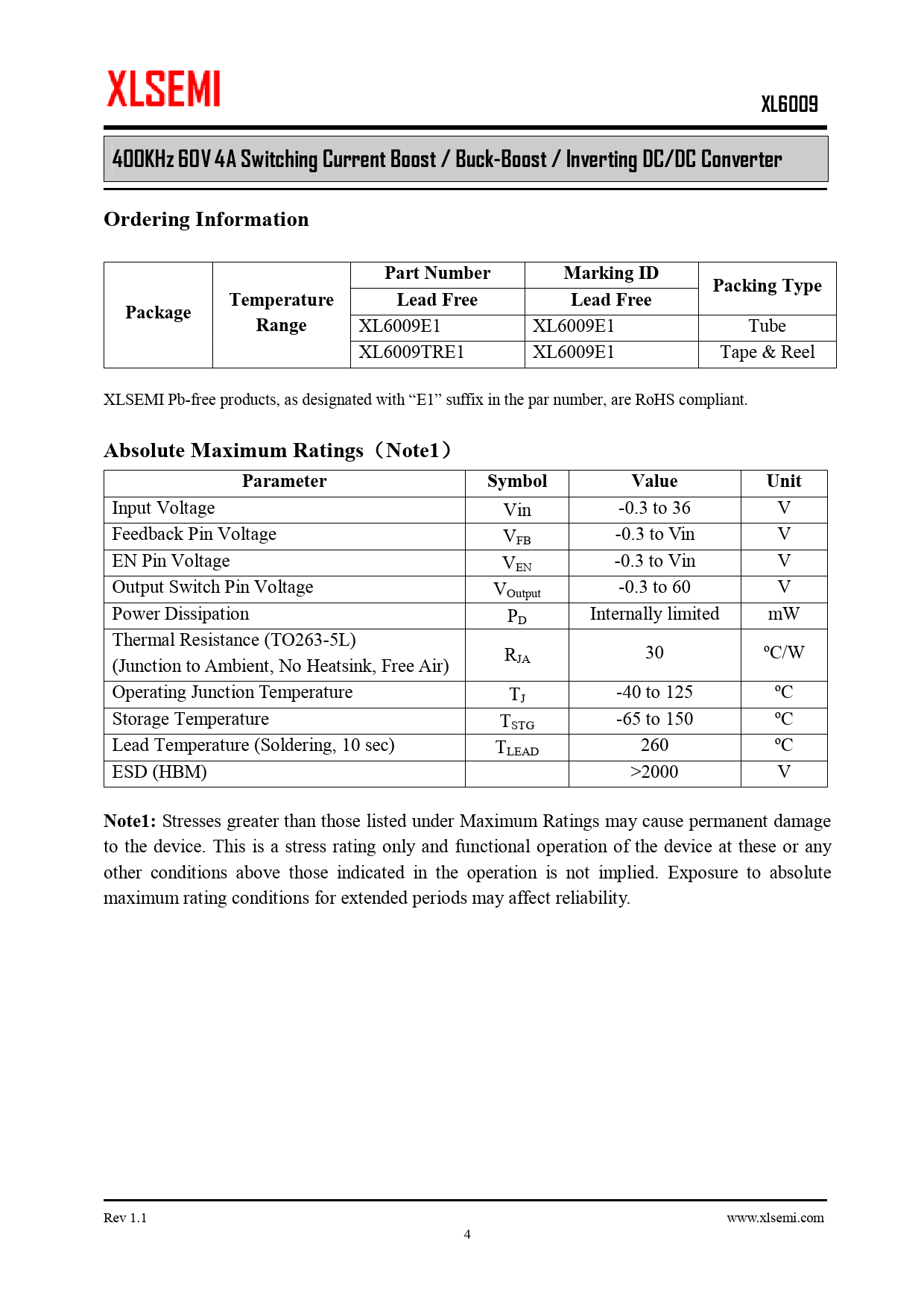 XL6009E1 XL6009E1 Tube XL6009TRE1 XL6009E1 Tape & Reel XLSEMI Pb-free products, as designated with “E1” suffix in the par number, are RoHS compliant.