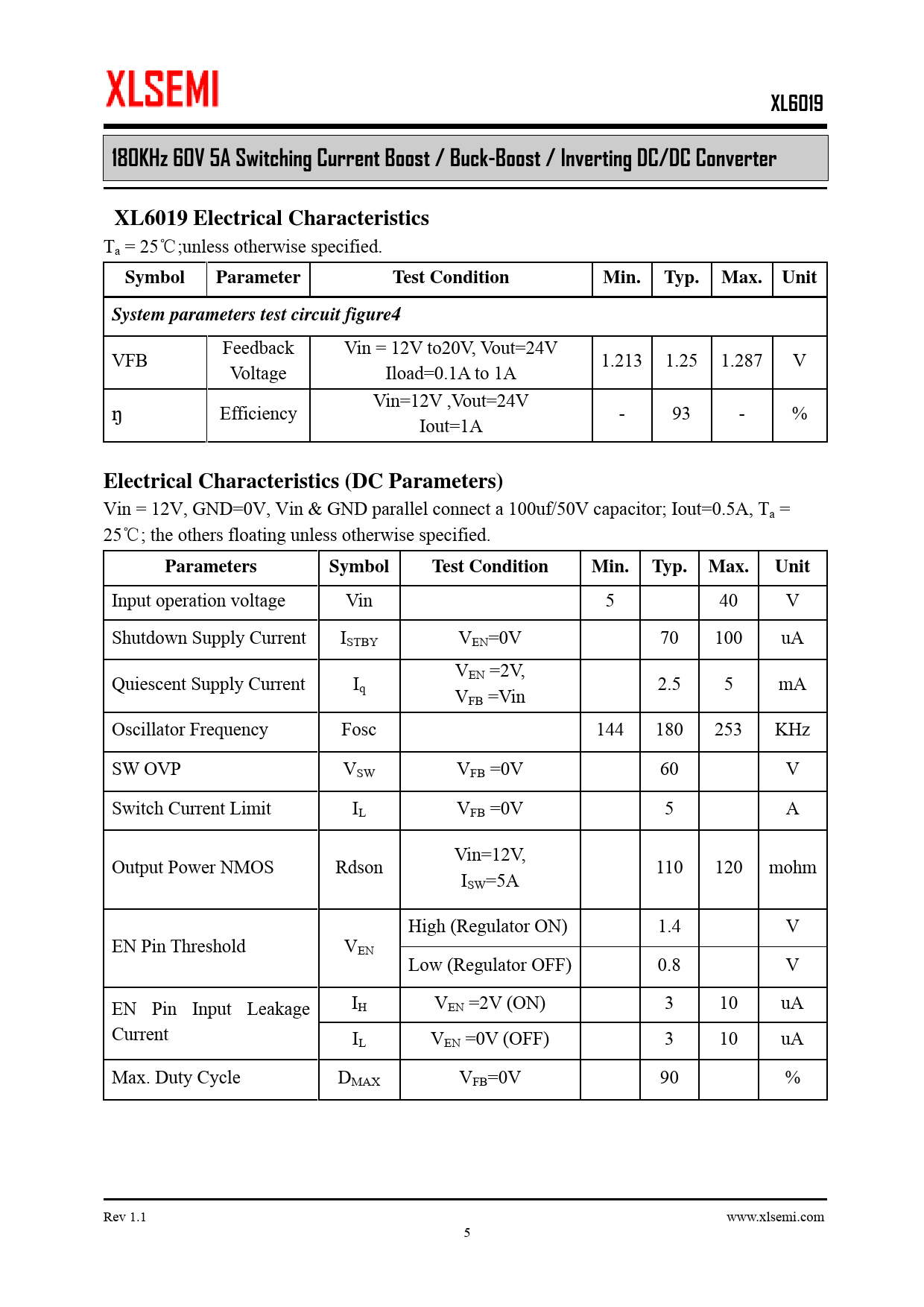 XL6019180KHz 60V 5A Switching Current Boost / Buck-Boost / Inverting DC/DC ConverterXL6019 Electrical Characteristics Ta = 25℃;unless otherwise specified. Symbol ParameterTestCondition Min.Typ.Max.UnitSystem parameters test circuit figure4 Feedback Vin = 12V to20V, Vout=24V VFB 1.213 1.25 1.287 V Voltage Iload=0.1A to 1A ŋ Efficiency Vin=12V ,Vout=24V - 93 - % Iout=1A Electrical Characteristics (DC Parameters) Vin = 12V, GND=0V, Vin & GND parallel connect a 100uf/50V capacitor; Iout=0.5A, Ta = 25℃; the others floating unless otherwise specified. Parameters SymbolTestConditionMin.Typ.Max.Unit Input operation voltage Vin 5 40 V Shutdown Supply Current ISTBY VEN=0V 70 100 uA V Quiescent Supply Current I EN =2V, q 2.5 5 mA VFB =Vin Oscillator Frequency Fosc 144 180 253 KHz SW OVP VSW VFB =0V 60 V Switch Current Limit IL VFB =0V 5 A Vin=12V, Output Power NMOS Rdson 110 120 mohm ISW=5A High (Regulator ON) 1.4 V EN Pin Threshold VEN Low (Regulator OFF) 0.8 V EN Pin Input Leakage IH VEN =2V (ON) 3 10 uA Current IL VEN =0V (OFF) 3 10 uA Max. Duty Cycle DMAX VFB=0V 90 % Rev 1.1 www.xlsemi.com 5
