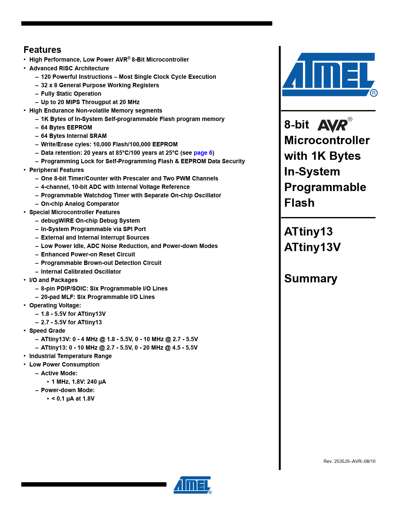 Datasheet ATtiny13, ATtiny13V - Summary (Microchip)