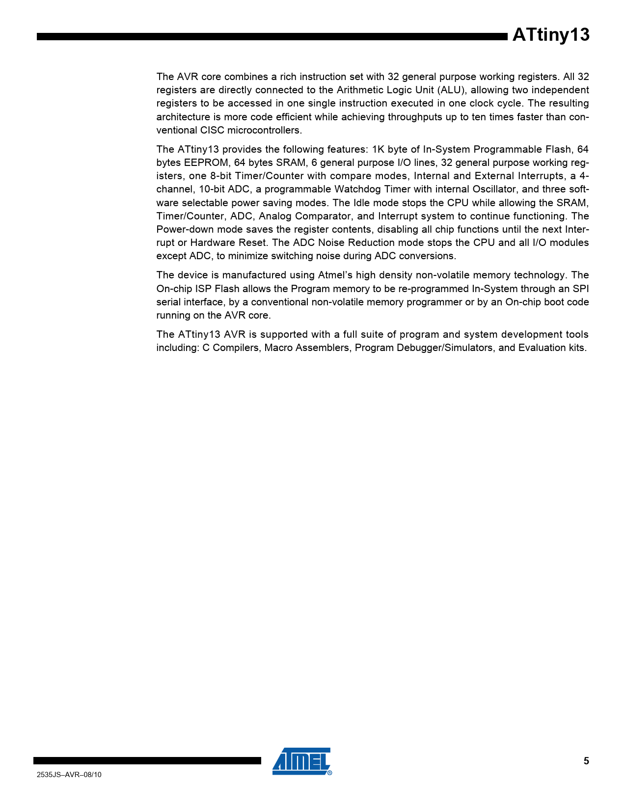 The AVR core combines a rich instruction set with 32 general purpose working registers. All 32 registers are directly connected to the Arithmetic Logic Unit (ALU), allowing two independent registers to be accessed in one single instruction executed in one clock cycle. The resulting architecture is more code efficient while achieving throughputs up to ten times faster than con- ventional CISC microcontrollers. The ATtiny13 provides the following features: 1K byte of In-System Programmable Flash, 64 bytes EEPROM, 64 bytes SRAM, 6 general purpose I/O lines, 32 general purpose working reg- isters, one 8-bit Timer/Counter with compare modes, Internal and External Interrupts, a 4- channel, 10-bit ADC, a programmable Watchdog Timer with internal Oscillator, and three soft- ware selectable power saving modes. The Idle mode stops the CPU while allowing the SRAM, Timer/Counter, ADC, Analog Comparator, and Interrupt system to continue functioning. The Power-down mode saves the register contents, disabling all chip functions until the next Inter- rupt or Hardware Reset. The ADC Noise Reduction mode stops the CPU and all I/O modules except ADC, to minimize switching noise during ADC conversions. The device is manufactured using Atmel’s high density non-volatile memory technology. The On-chip ISP Flash allows the Program memory to be re-programmed In-System through an SPI serial interface, by a conventional non-volatile memory programmer or by an On-chip boot code running on the AVR core. The ATtiny13 AVR is supported with a full suite of program and system development tools including: C Compilers, Macro Assemblers, Program Debugger/Simulators, and Evaluation kits.