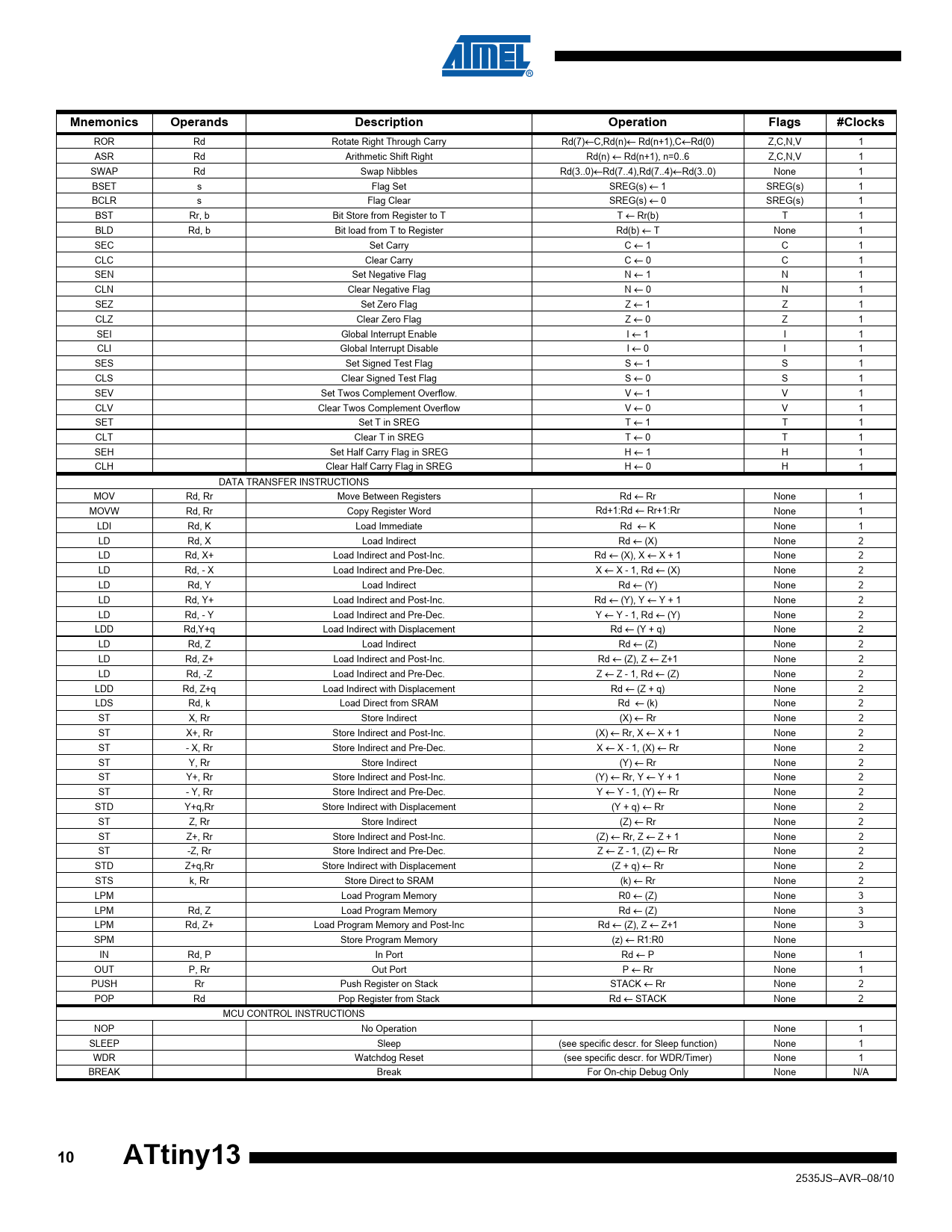 Mnemonics. Operands. Description. Operation. Flags. #Clocks. ATtiny13