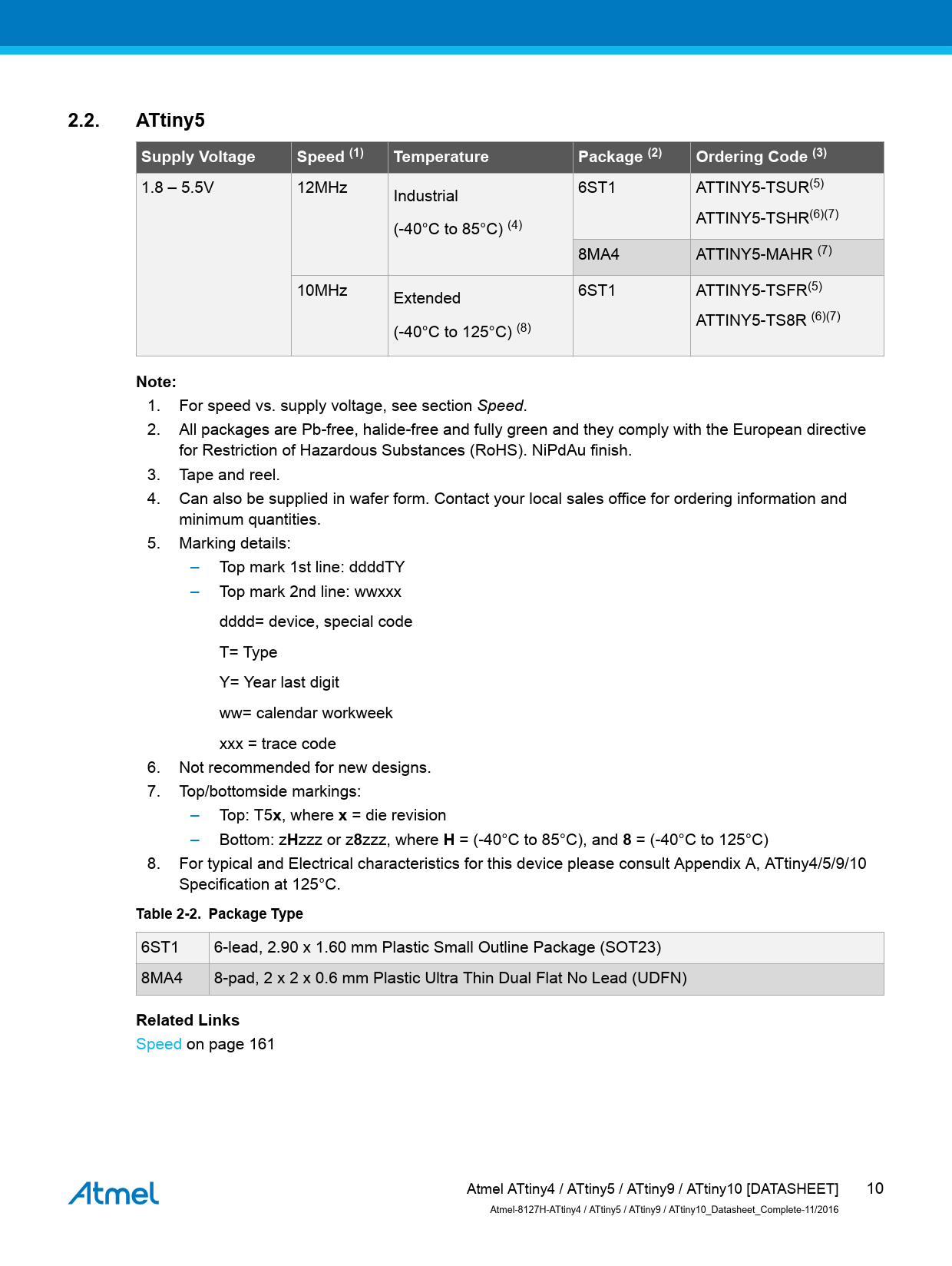 2.2. ATtiny5. Supply Voltage. Speed (1). Temperature. Package (2). Ordering Code (3). Note: . Table 2-2. Package Type. Related Links