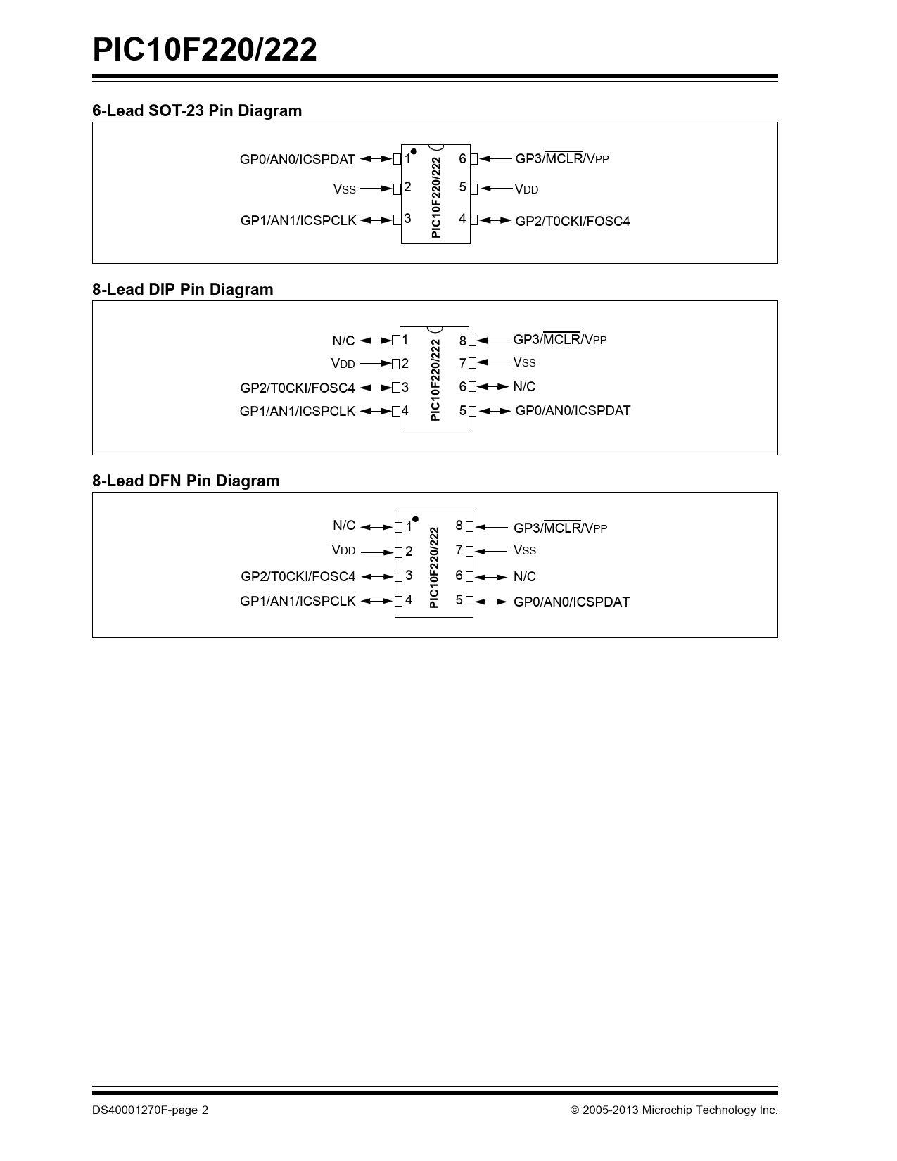 PIC10F220/222. 6-Lead SOT-23 Pin Diagram. 220/. C10F. 8-Lead DIP Pin Diagram. 222. 8-Lead DFN Pin Diagram. IC10F