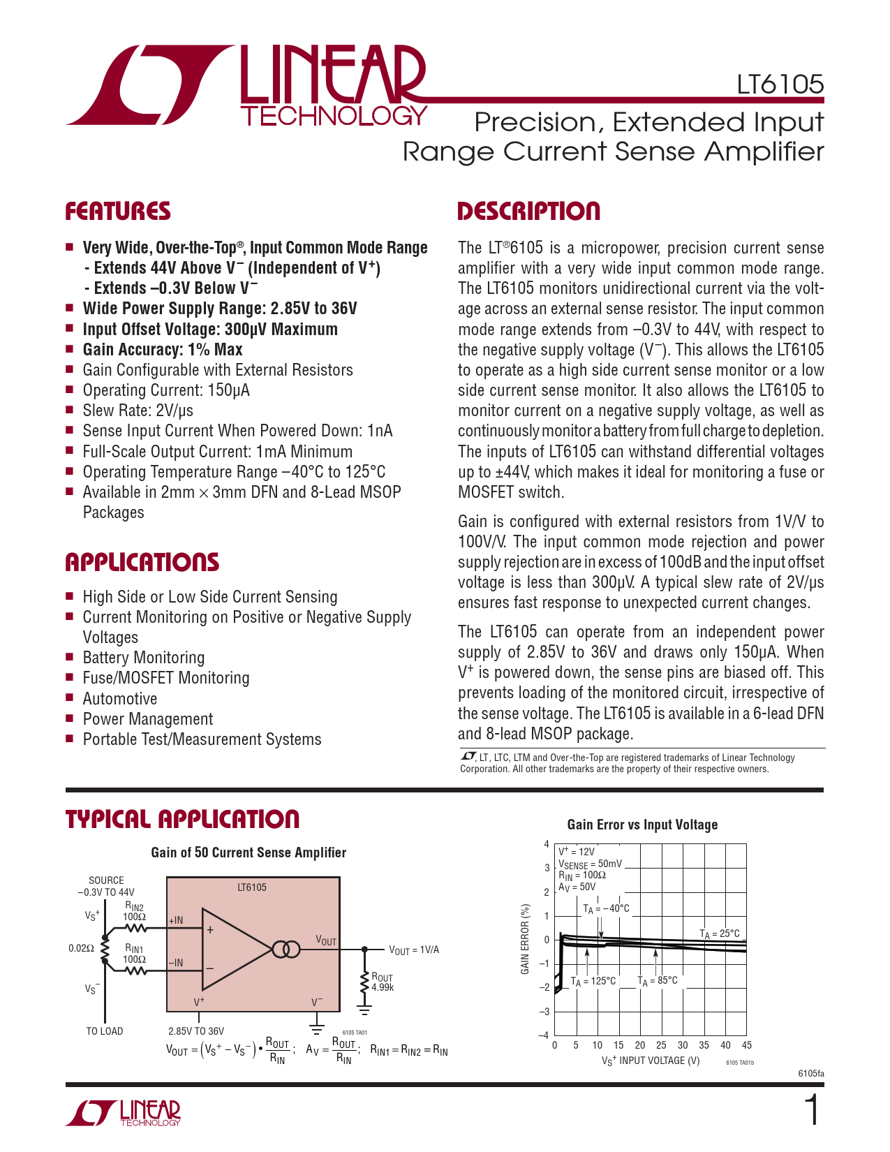 supply rejection are in excess of 100dB and the input offset voltage is less than 300μV. A typical slew rate of 2V/μs n High Side or Low Side Current Sensing ensures fast response to unexpected current changes. n Current Monitoring on Positive or Negative Supply The LT6105 can operate from an independent power Voltages n supply of 2.85V to 36V and draws only 150μA. When Battery Monitoring n V+ is powered down, the sense pins are biased off. This Fuse/MOSFET Monitoring n prevents loading of the monitored circuit, irrespective of Automotive n the sense voltage. The LT6105 is available in a 6-lead DFN Power Management n and 8-lead MSOP package. Portable Test/Measurement Systems , LT, LTC, LTM and Over-the-Top are registered trademarks of Linear Technology Corporation. All other trademarks are the property of their respective owners.
