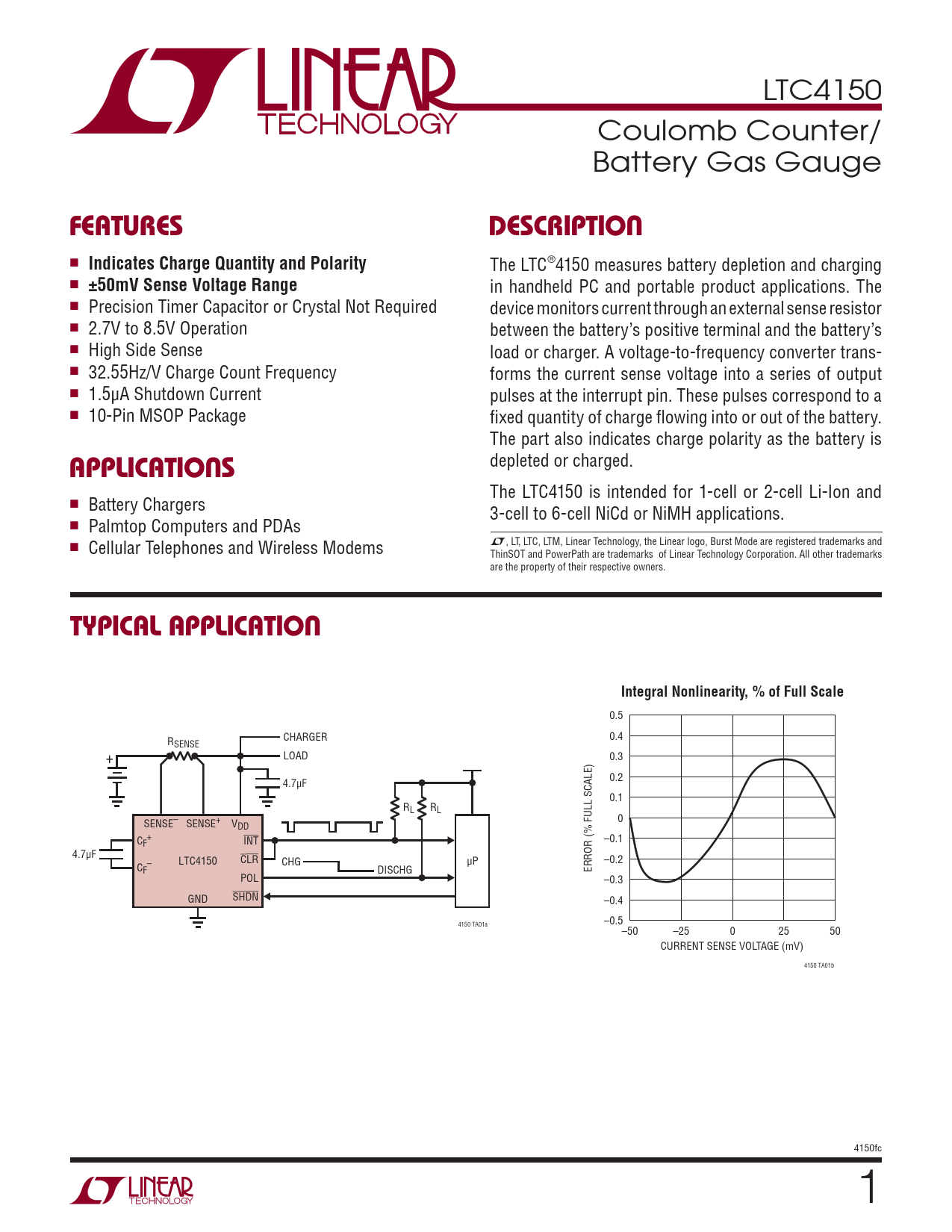depleted or charged. The LTC4150 is intended for 1-cell or 2-cell Li-Ion and n Battery Chargers 3-cell to 6-cell NiCd or NiMH applications. n Palmtop Computers and PDAs n Cellular Telephones and Wireless Modems L, LT, LTC, LTM, Linear Technology, the Linear logo, Burst Mode are registered trademarks and ThinSOT and PowerPath are trademarks of Linear Technology Corporation. All other trademarks are the property of their respective owners.