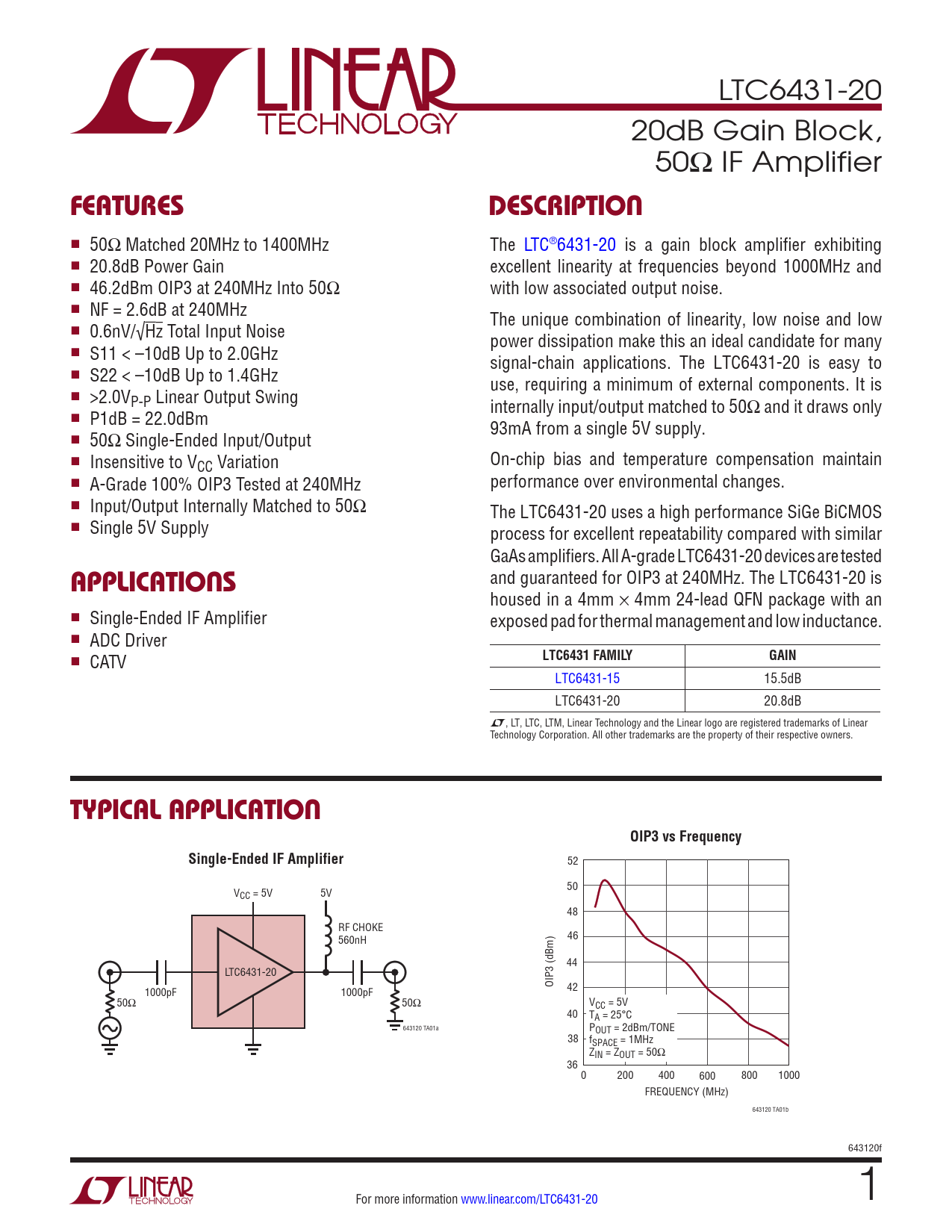 FEATURES. DESCRIPTION. APPLICATIONS. LTC6431 FAMILY. GAIN. TYPICAL APPLICATION. OIP3 vs Frequency. Single-Ended IF Amplifier