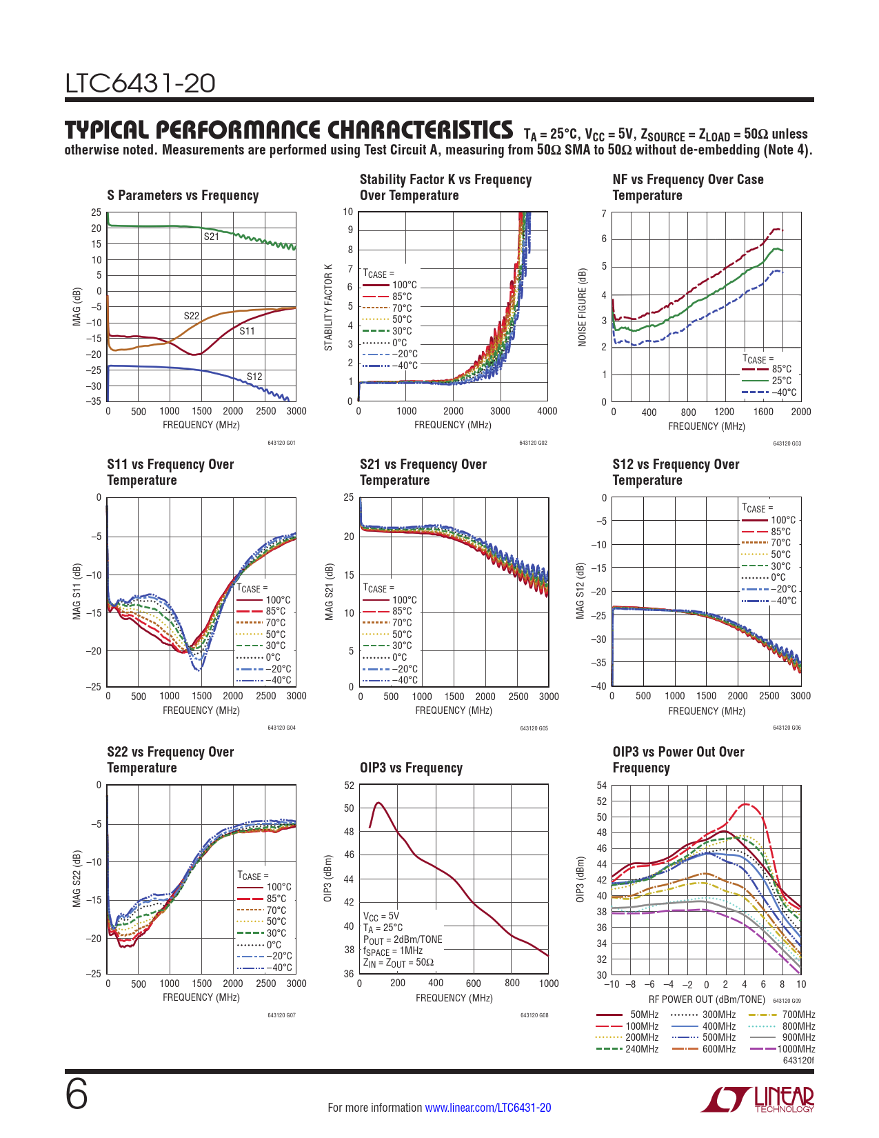 0 52 54 52 50 50 –5 48 48 46 46 –10 44 TCASE = 44 42 100°C 40 MAG S22 (dB) –15 85°C OIP3 (dBm) 42 OIP3 (dBm) 70°C 38 50°C VCC = 5V 40 TA = 25°C 36 –20 30°C 0°C POUT = 2dBm/TONE 34 38 –20°C fSPACE = 1MHz 32 –40°C ZIN = ZOUT = 50Ω –25 36 30 0 500 1000 1500 2000 2500 3000 0 200 400 600 800 1000 –10 –8 –6 –4 –2 0 2 4 6 8 10 FREQUENCY (MHz) FREQUENCY (MHz) RF POWER OUT (dBm/TONE) 643120 G09 643120 G07 643120 G08 50MHz 300MHz 700MHz 100MHz 400MHz 800MHz 200MHz 500MHz 900MHz 240MHz 600MHz 1000MHz 643120f 6 For more information www.linear.com/LTC6431-20 Document Outline Features Applications Description Typical Application Absolute Maximum Ratings Order Information DC Electrical Characteristics AC Electrical Characteristics Typical Performance Characteristics Block Diagram Test Circuit A Operation Applications Information Demo Board S Parameters Package Description Typical Application Related Parts