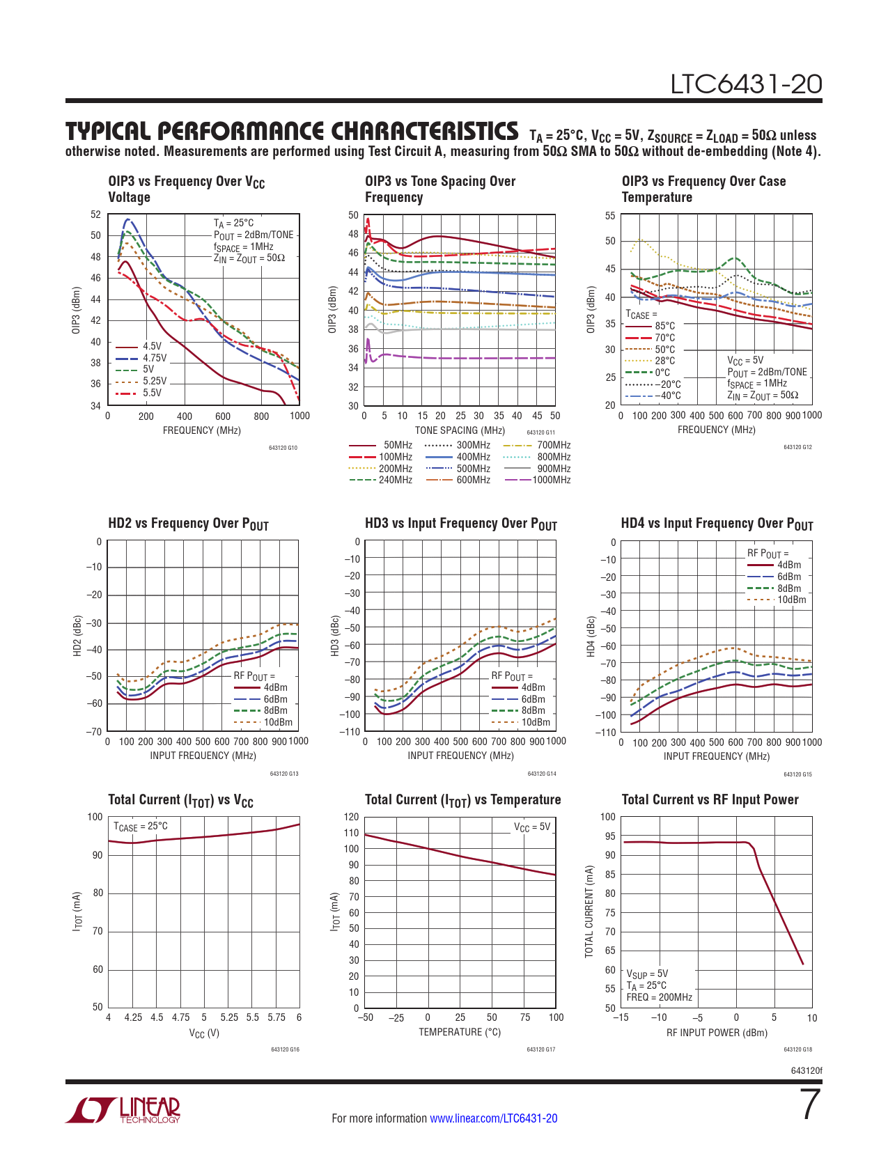 100 120 100 TCASE = 25°C V 110 CC = 5V 95 90 100 90 90 85 80 80 70 80 (mA) (mA) 60 75 I TOT 70 I TOT 50 70 40 65 30 TOTAL CURRENT (mA) 60 60 20 VSUP = 5V T 10 55 A = 25°C FREQ = 200MHz 50 0 50 4 4.25 4.5 4.75 5 5.25 5.5 5.75 6 –50 –25 0 25 50 75 100 –15 –10 –5 0 5 10 VCC (V) TEMPERATURE (°C) RF INPUT POWER (dBm) 643120 G16 643120 G17 643120 G18 643120f For more information www.linear.com/LTC6431-20 7 Document Outline Features Applications Description Typical Application Absolute Maximum Ratings Order Information DC Electrical Characteristics AC Electrical Characteristics Typical Performance Characteristics Block Diagram Test Circuit A Operation Applications Information Demo Board S Parameters Package Description Typical Application Related Parts