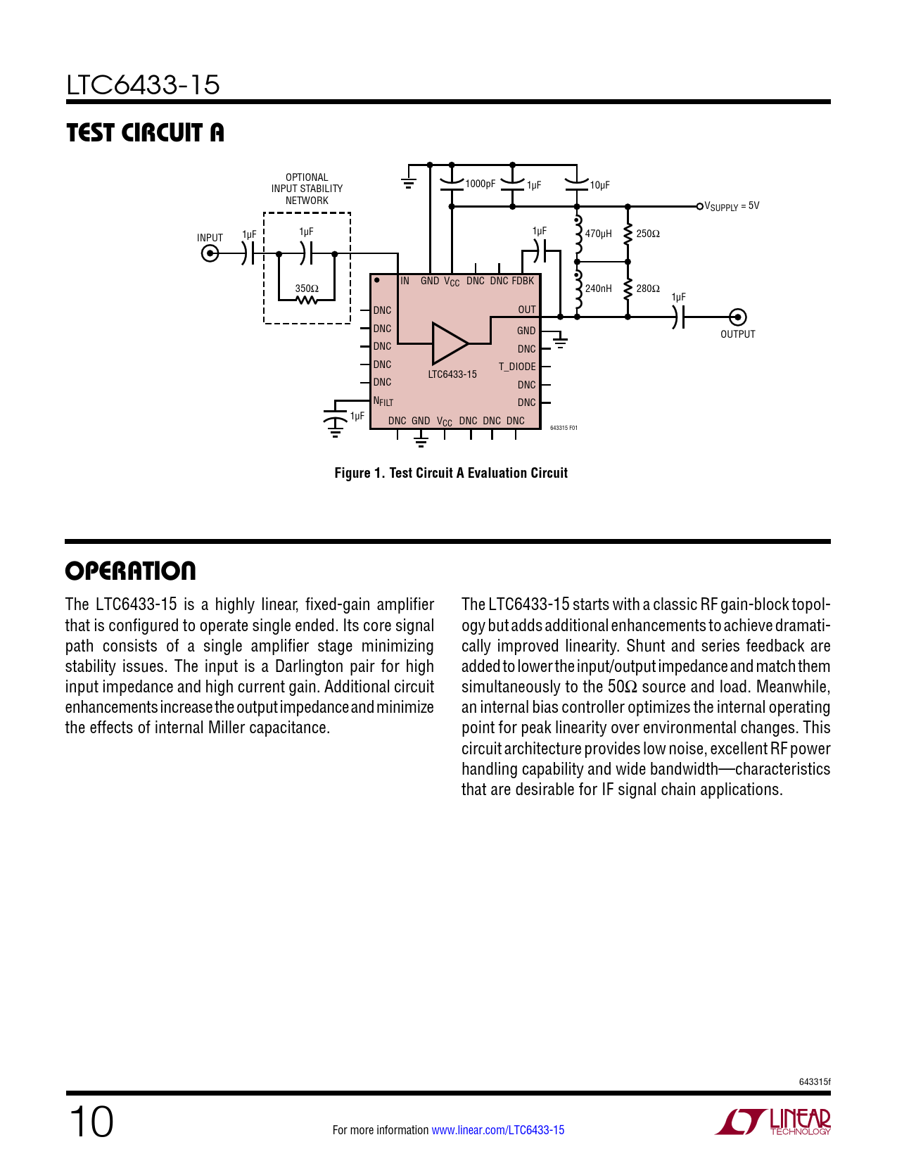 OPTIONAL 1000pF 1µF 10µF INPUT STABILITY NETWORK VSUPPLY = 5V 1µF 1µF INPUT 1µF 470µH 250Ω IN GND VCC DNC DNC FDBK 350Ω 240nH 280Ω 1µF DNC OUT DNC GND OUTPUT DNC DNC DNC T_DIODE LTC6433-15 DNC DNC NFILT DNC 1µF DNC GND VCC DNC DNC DNC 643315 F01
