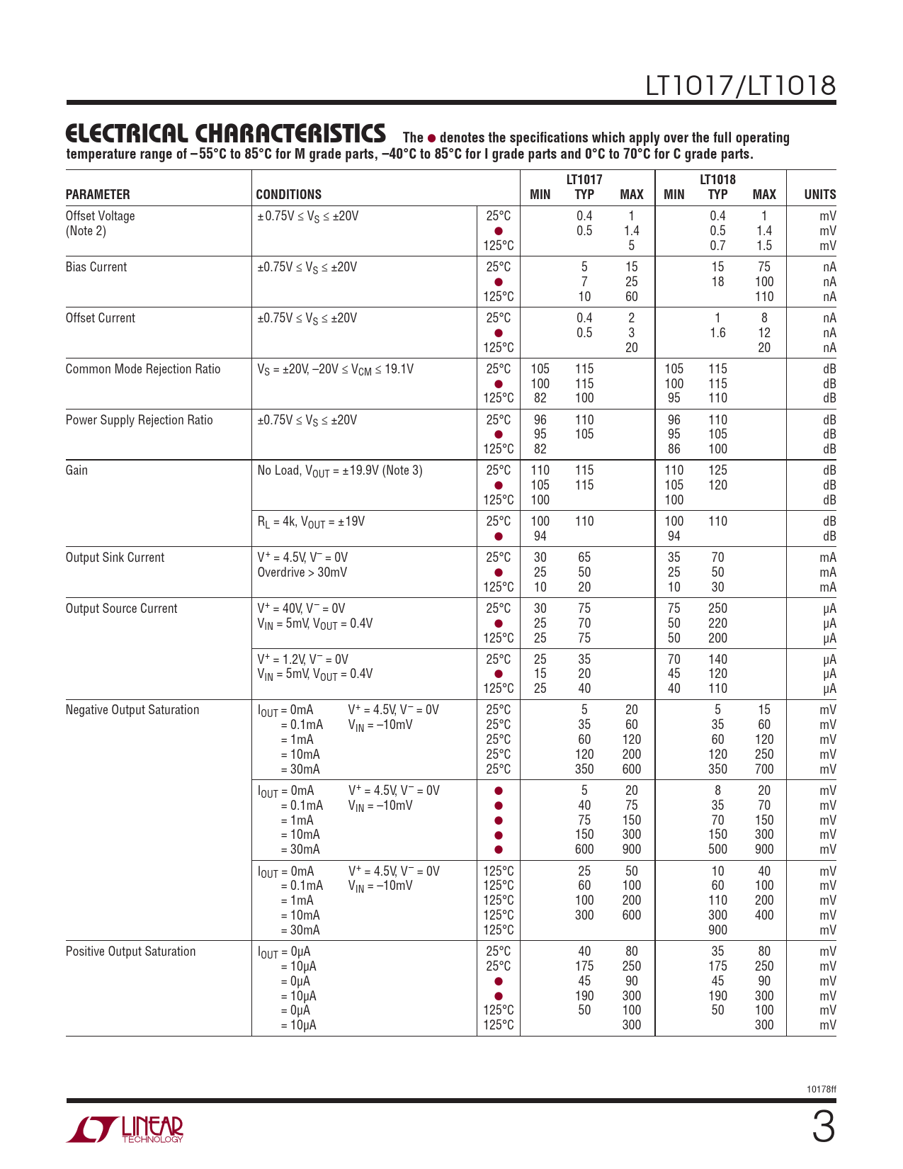 denotes the specifi cations which apply over the full operating temperature range of – 55°C to 85°C for M grade parts, –40°C to 85°C for I grade parts and 0°C to 70°C for C grade parts. LT1017 LT1018 PARAMETER CONDITIONS MIN TYP MAX MIN TYP MAX UNITS