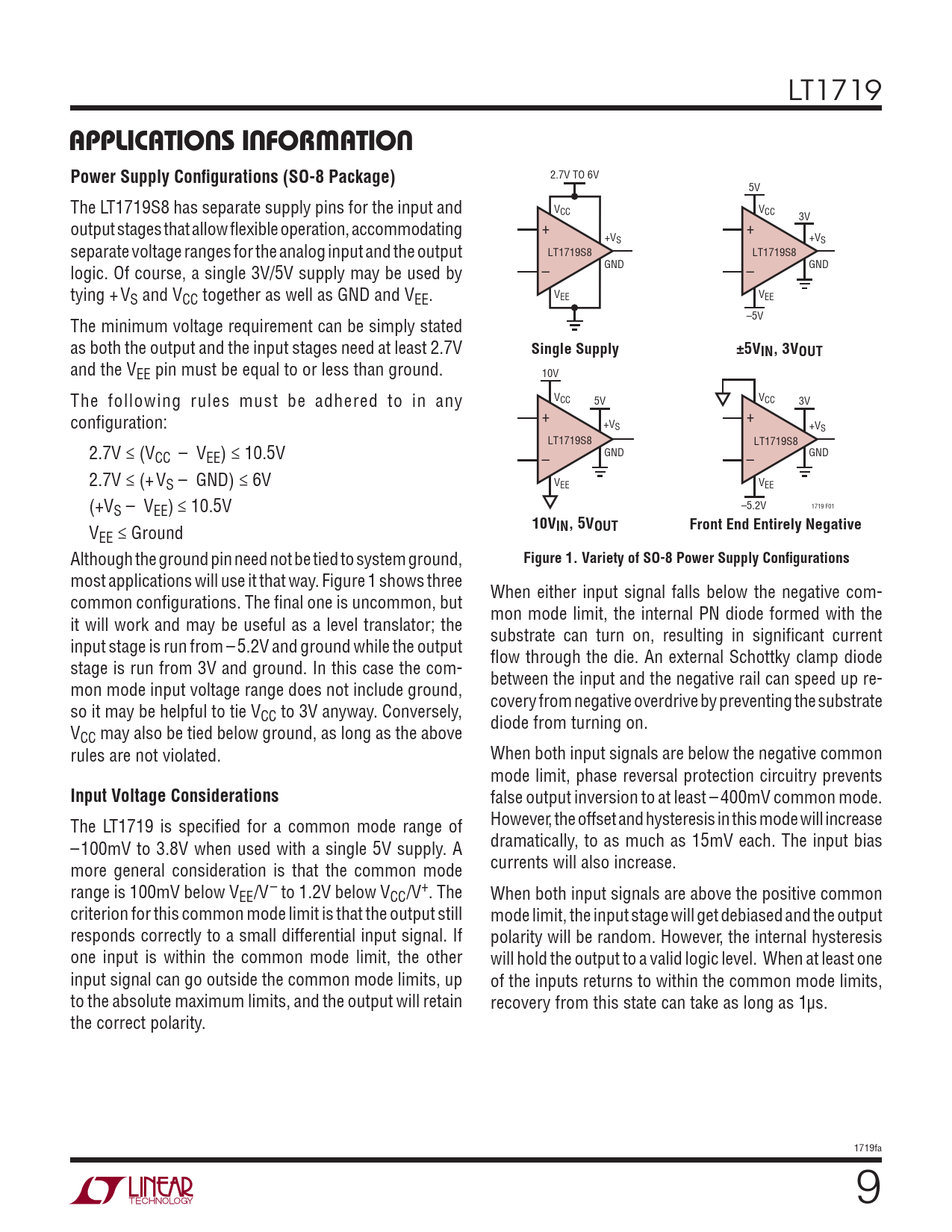 and the VEE pin must be equal to or less than ground. 10V The following rules must be adhered to in any VCC 5V VCC 3V confi guration: + + +VS +VS LT1719S8 LT1719S8 2.7V ≤ (VCC – VEE) ≤ 10.5V GND GND – – 2.7V ≤ (+ VS – GND) ≤ 6V VEE VEE (+VS – VEE) ≤ 10.5V –5.2V 1719 F01