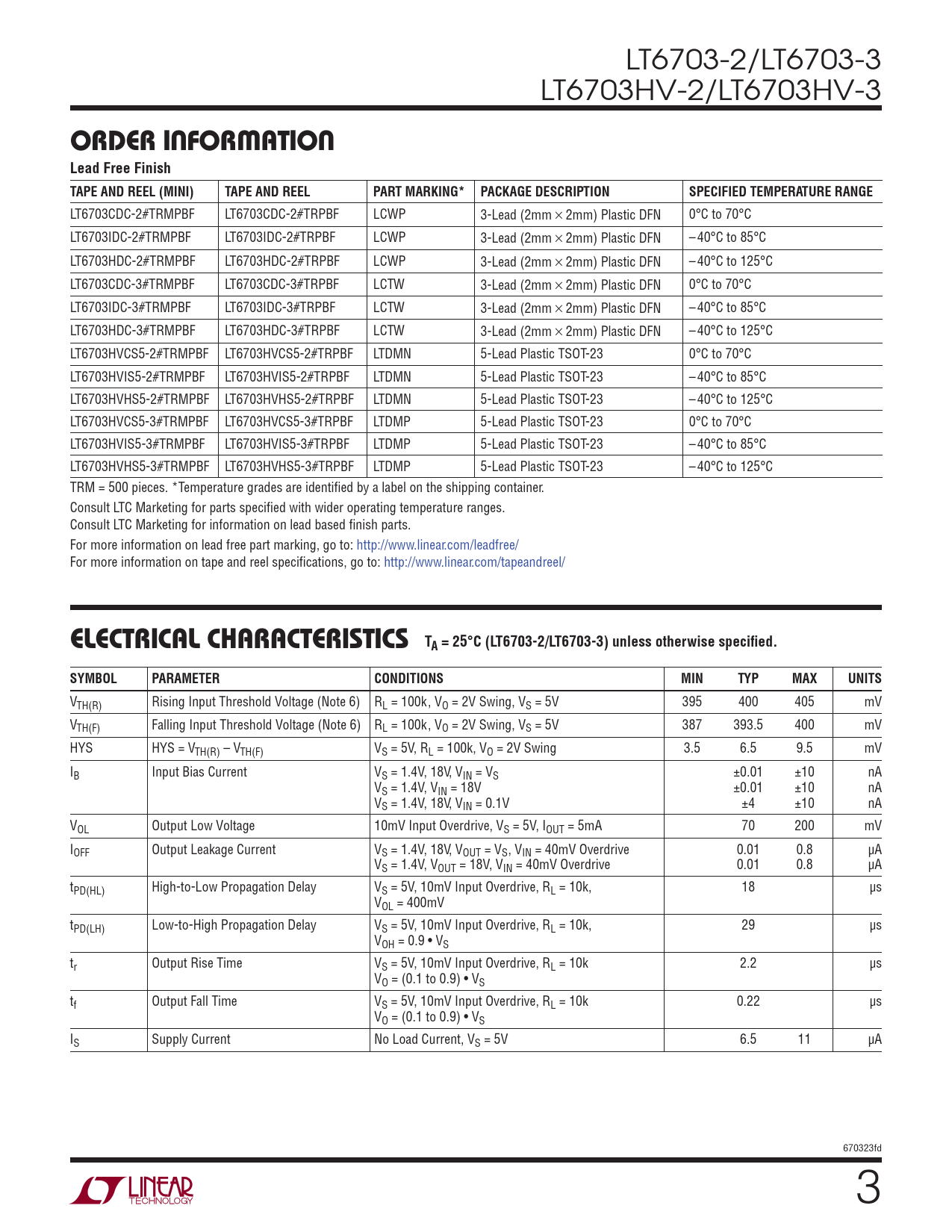 LT6703CDC-2#TRMPBF LT6703CDC-2#TRPBF LCWP 3-Lead (2mm × 2mm) Plastic DFN 0°C to 70°C LT6703IDC-2#TRMPBF LT6703IDC-2#TRPBF LCWP 3-Lead (2mm × 2mm) Plastic DFN – 40°C to 85°C LT6703HDC-2#TRMPBF LT6703HDC-2#TRPBF LCWP 3-Lead (2mm × 2mm) Plastic DFN – 40°C to 125°C LT6703CDC-3#TRMPBF LT6703CDC-3#TRPBF LCTW 3-Lead (2mm × 2mm) Plastic DFN 0°C to 70°C LT6703IDC-3#TRMPBF LT6703IDC-3#TRPBF LCTW 3-Lead (2mm × 2mm) Plastic DFN – 40°C to 85°C LT6703HDC-3#TRMPBF LT6703HDC-3#TRPBF LCTW 3-Lead (2mm × 2mm) Plastic DFN – 40°C to 125°C LT6703HVCS5-2#TRMPBF LT6703HVCS5-2#TRPBF LTDMN 5-Lead Plastic TSOT-23 0°C to 70°C LT6703HVIS5-2#TRMPBF LT6703HVIS5-2#TRPBF LTDMN 5-Lead Plastic TSOT-23 – 40°C to 85°C LT6703HVHS5-2#TRMPBF LT6703HVHS5-2#TRPBF LTDMN 5-Lead Plastic TSOT-23 – 40°C to 125°C LT6703HVCS5-3#TRMPBF LT6703HVCS5-3#TRPBF LTDMP 5-Lead Plastic TSOT-23 0°C to 70°C LT6703HVIS5-3#TRMPBF LT6703HVIS5-3#TRPBF LTDMP 5-Lead Plastic TSOT-23 – 40°C to 85°C LT6703HVHS5-3#TRMPBF LT6703HVHS5-3#TRPBF LTDMP 5-Lead Plastic TSOT-23 – 40°C to 125°C TRM = 500 pieces. *Temperature grades are identifi ed by a label on the shipping container. Consult LTC Marketing for parts specifi ed with wider operating temperature ranges. Consult LTC Marketing for information on lead based fi nish parts. For more information on lead free part marking, go to: http://www.linear.com/leadfree/ For more information on tape and reel specifi cations, go to: http://www.linear.com/tapeandreel/