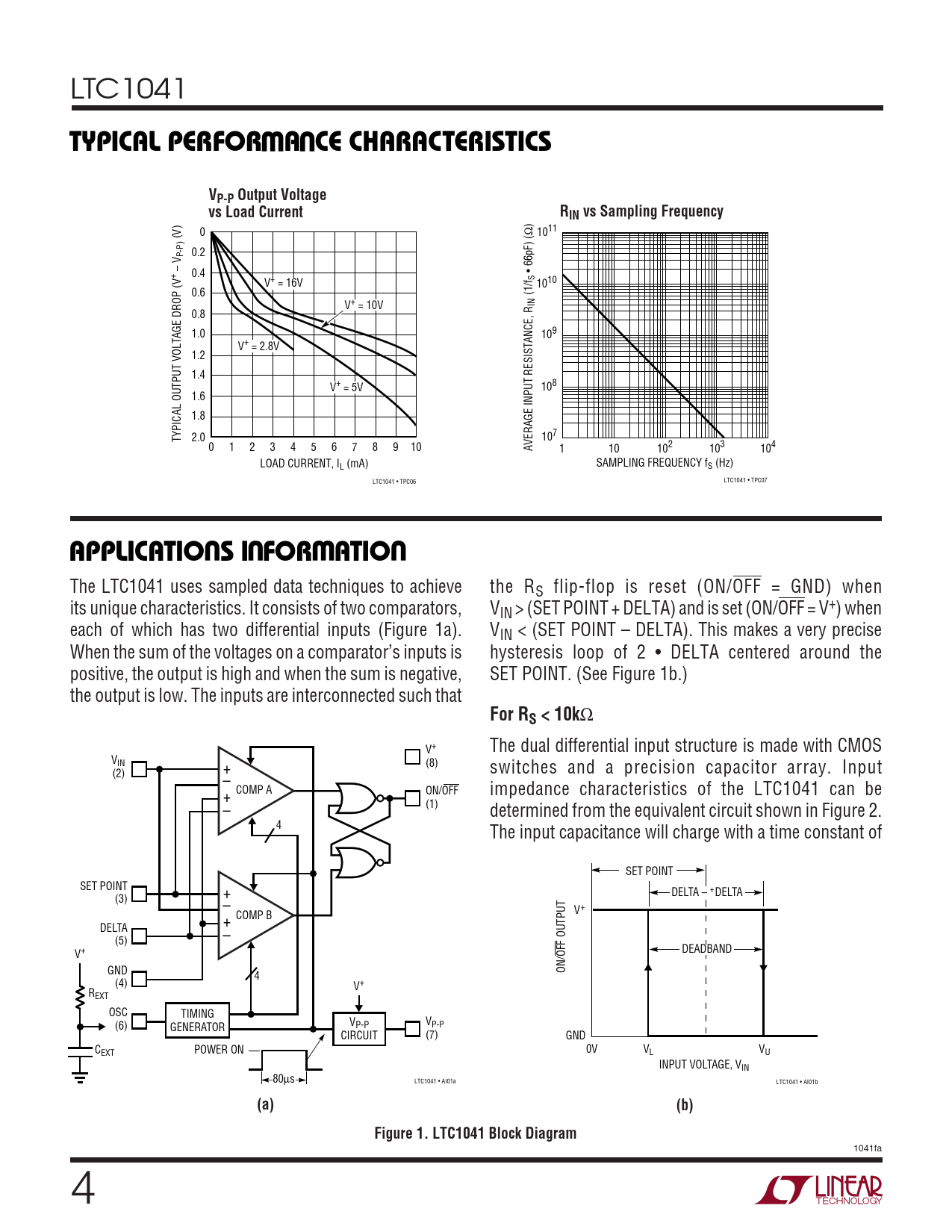 LTC1041 WUTYPICAL PERFOR A CE CHARACTERISTICSVP-P Output Voltagevs Load CurrentRIN vs Sampling Frequency ) 0 Ω (V) 1011 ) P-P 0.2 – V+ 0.4 • 66pF) ( V S V+ = 16V 1010 0.6 (1/f V+ = 10V IN 0.8 1.0 109 V+ = 2.8V 1.2 1.4 V+ = 5V 108 1.6 1.8 TYPICAL OUTPUT VOLTAGE DROP ( 2.0 107 0 1 2 3 4 5 6 7 8 9 10 AVERAGE INPUT RESISTANCE, R 1 102 104 103 10 LOAD CURRENT, IL (mA) SAMPLING FREQUENCY fS (Hz) LTC1041 • TPC06 LTC1041 • TPC07 UUWUAPPLICATIO S I FOR ATIO The LTC1041 uses sampled data techniques to achieve the RS flip-flop is reset (ON/OFF = GND) when its unique characteristics. It consists of two comparators, VIN > (SET POINT + DELTA) and is set (ON/OFF = V+) when each of which has two differential inputs (Figure 1a). VIN < (SET POINT – DELTA). This makes a very precise When the sum of the voltages on a comparator’s inputs is hysteresis loop of 2 • DELTA centered around the positive, the output is high and when the sum is negative, SET POINT. (See Figure 1b.) the output is low. The inputs are interconnected such that For RS < 10k Ω V+ The dual differential input structure is made with CMOS VIN (8) + switches and a precision capacitor array. Input (2) – ON/OFF impedance characteristics of the LTC1041 can be + COMP A (1) – determined from the equivalent circuit shown in Figure 2. 4 The input capacitance will charge with a time constant of SET POINT SET POINT + DELTA – +DELTA (3) – V+ + COMP B DELTA (5) – DEADBAND V+ GND ON/OFF OUTPUT 4 (4) V+ REXT OSC TIMING (6) VP-P GENERATOR VP-P CIRCUIT (7) GND CEXT POWER ON 0V VL VU INPUT VOLTAGE, VIN 80µs LTC1041 • AI01a LTC1041 • AI01b (a)(b)Figure 1. LTC1041 Block Diagram 1041fa 4