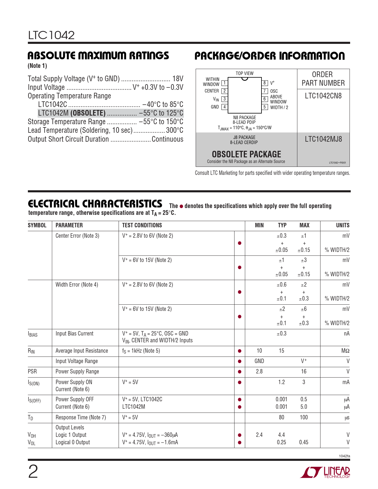 LTC1042 WWWUUWUABSOLUTE AXI U RATI GSPACKAGE/ORDER I FOR ATIO(Note 1) TOP VIEW ORDER Total Supply Voltage (V+ to GND) .. 18V WITHIN 1 8 V+ WINDOW PART NUMBER Input Voltage ... V+ +0.3V to – 0.3V CENTER 2 7 OSC Operating Temperature Range ABOVE LTC1042CN8 V 3 IN 6 WINDOW LTC1042C ... – 40°C to 85°C GND 4 5 WIDTH / 2 LTC1042M (OBSOLETE) ... – 55°C to 125°C N8 PACKAGE Storage Temperature Range ... – 55 8-LEAD PDIP °C to 150°C TJMAX = 110°C, θJA = 150°C/W Lead Temperature (Soldering, 10 sec).. 300°C J8 PACKAGE Output Short Circuit Duration ... Continuous LTC1042MJ8 8-LEAD CERDIP OBSOLETE PACKAGE Consider the N8 Package as an Alternate Source LTC1042 • POI01 Consult LTC Marketing for parts specified with wider operating temperature ranges. ELECTRICAL CHARACTERISTICS The ● denotes the specifications which apply over the full operatingtemperature range, otherwise specifications are at TA = 25 ° C.SYMBOLPARAMETERTEST CONDITIONSMINTYPMAXUNITS Center Error (Note 3) V+ = 2.8V to 6V (Note 2) ±0.3 ±1 mV ● + + ±0.05 ±0.15 % WIDTH/2 V+ = 6V to 15V (Note 2) ±1 ±3 mV ● + + ±0.05 ±0.15 % WIDTH/2 Width Error (Note 4) V+ = 2.8V to 6V (Note 2) ±0.6 ±2 mV ● + + ±0.1 ±0.3 % WIDTH/2 V+ = 6V to 15V (Note 2) ±2 ±6 mV ● + + ±0.1 ±0.3 % WIDTH/2 IBIAS Input Bias Current V+ = 5V, TA = 25°C, OSC = GND ±0.3 nA VIN, CENTER and WIDTH/2 Inputs RIN Average lnput Resistance fS = 1kHz (Note 5) ● 10 15 MΩ Input Voltage Range ● GND V + V PSR Power Supply Range ● 2.8 16 V IS(ON) Power Supply ON V+ = 5V ● 1.2 3 mA Current (Note 6) IS(OFF) Power Supply OFF V+ = 5V, LTC1042C ● 0.001 0.5 µA Current (Note 6) LTC1042M ● 0.001 5.0 µA TD Response Time (Note 7) V+ = 5V 80 100 µs Output Levels VOH Logic 1 Output V+ = 4.75V, lOUT = –360µA ● 2.4 4.4 V VOL Logical 0 Output V+ = 4.75V, lOUT = –1.6mA ● 0.25 0.45 V 1042fa 2