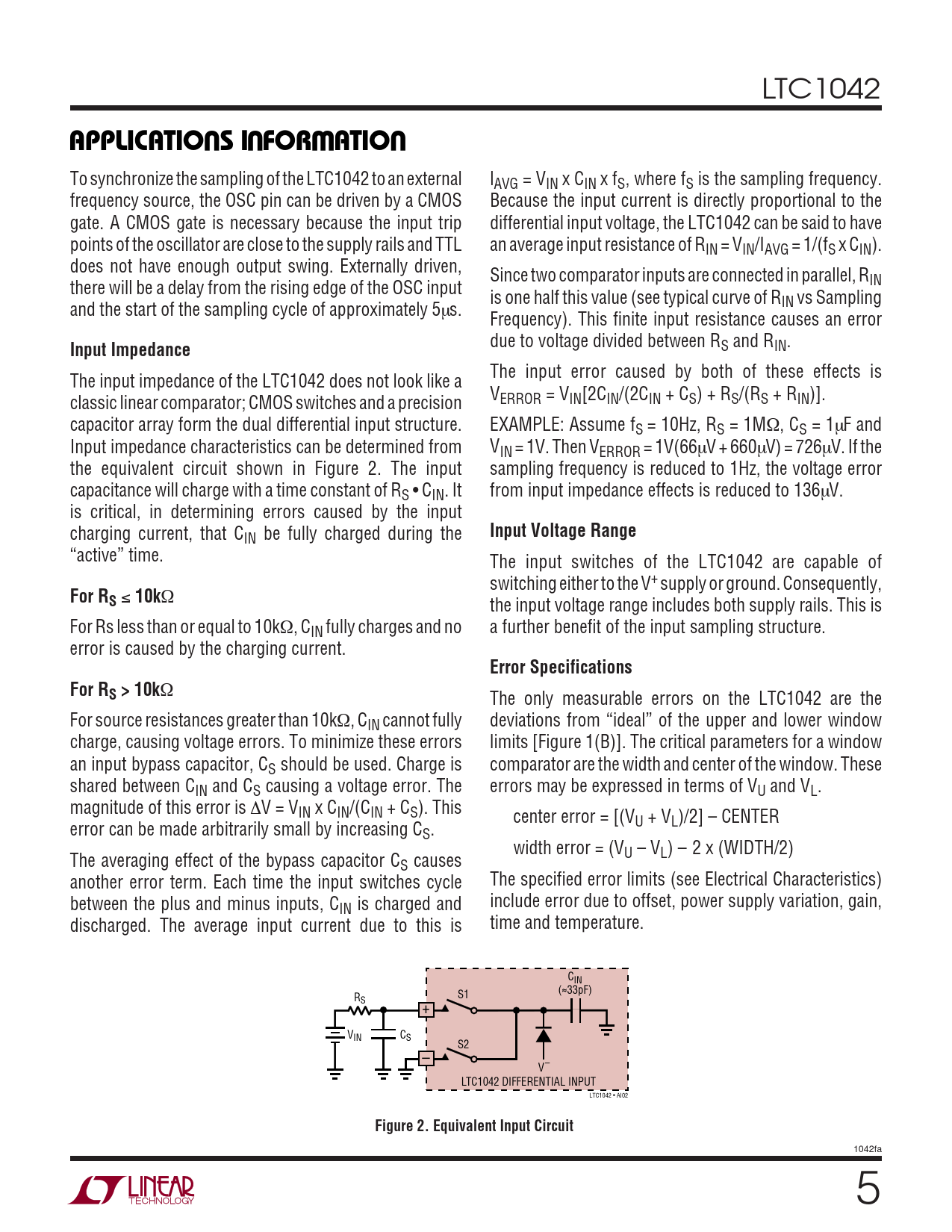 To synchronize the sampling of the LTC1042 to an external lAVG = VIN x CIN x fS, where fS is the sampling frequency. frequency source, the OSC pin can be driven by a CMOS Because the input current is directly proportional to the gate. A CMOS gate is necessary because the input trip differential input voltage, the LTC1042 can be said to have points of the oscillator are close to the supply rails and TTL an average input resistance of RIN = VIN/IAVG = 1/(fS x CIN). does not have enough output swing. Externally driven, Since two comparator inputs are connected in parallel, R there will be a delay from the rising edge of the OSC input IN is one half this value (see typical curve of R and the start of the sampling cycle of approximately 5µs. IN vs Sampling Frequency). This finite input resistance causes an error due to voltage divided between R