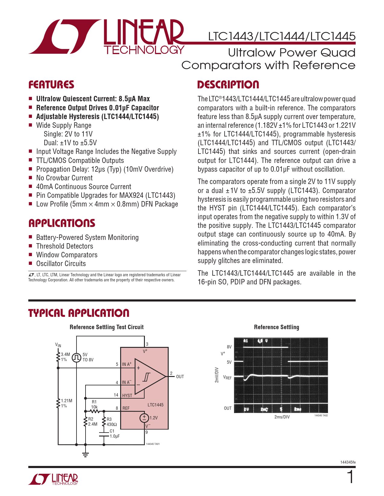 LTC1443/LTC1444/LTC1445 Ultralow Power Quad Comparators with Reference FeaTuresDescripTion n Ultralow Quiescent Current: 8.5µA Max The LTC®1443/LTC1444/LTC1445 are ultralow power quad n Reference Output Drives 0.01µF Capacitor comparators with a built-in reference. The comparators n Adjustable Hysteresis (LTC1444/LTC1445) feature less than 8.5µA supply current over temperature, n Wide Supply Range an internal reference (1.182V ±1% for LTC1443 or 1.221V Single: 2V to 11V ±1% for LTC1444/LTC1445), programmable hysteresis Dual: ±1V to ±5.5V (LTC1444/LTC1445) and TTL/CMOS output (LTC1443/ n Input Voltage Range Includes the Negative Supply LTC1445) that sinks and sources current (open-drain n TTL/CMOS Compatible Outputs output for LTC1444). The reference output can drive a n Propagation Delay: 12µs (Typ) (10mV Overdrive) bypass capacitor of up to 0.01µF without oscillation. n No Crowbar Current The comparators operate from a single 2V to 11V supply n 40mA Continuous Source Current or a dual ±1V to ±5.5V supply (LTC1443). Comparator n Pin Compatible Upgrades for MAX924 (LTC1443) hysteresis is easily programmable using two resistors and n Low Profile (5mm × 4mm × 0.8mm) DFN Package the HYST pin (LTC1444/LTC1445). Each comparator’s input operates from the negative supply to within 1.3V of applicaTions the positive supply. The LTC1443/LTC1445 comparator n output stage can continuously source up to 40mA. By Battery-Powered System Monitoring n eliminating the cross-conducting current that normally Threshold Detectors n happens when the comparator changes logic states, power Window Comparators n supply glitches are eliminated. Oscillator Circuits L, LT, LTC, LTM, Linear Technology and the Linear logo are registered trademarks of Linear The LTC1443/LTC1444/LTC1445 are available in the Technology Corporation. All other trademarks are the property of their respective owners. 16-pin SO, PDIP and DFN packages. Typical applicaTionReference Settling Test CircuitReference Settling V 3 IN 8V V+ 3.4M 5V V+ 1% TO 8V IN A+ 5 5V + 2 OUT VREF 4 IN A– – 2mV/DIV 14 HYST 1.21M R1 1% 10k LTC1445 8 REF OUT + 1.2V 144345 TA02 R2 R3 – 2ms/DIV 2.4M 430Ω V– C1 9 1.0µF 144345 TA01 144345fe 1 Document Outline Features Applications Description Absolute Maximum Ratings Typical Application Pin Configuration Order Information Electrical Characteristics Typical Performance Characteristics Pin Functions Applications Information Package Description Revision History Typical Application Related Parts