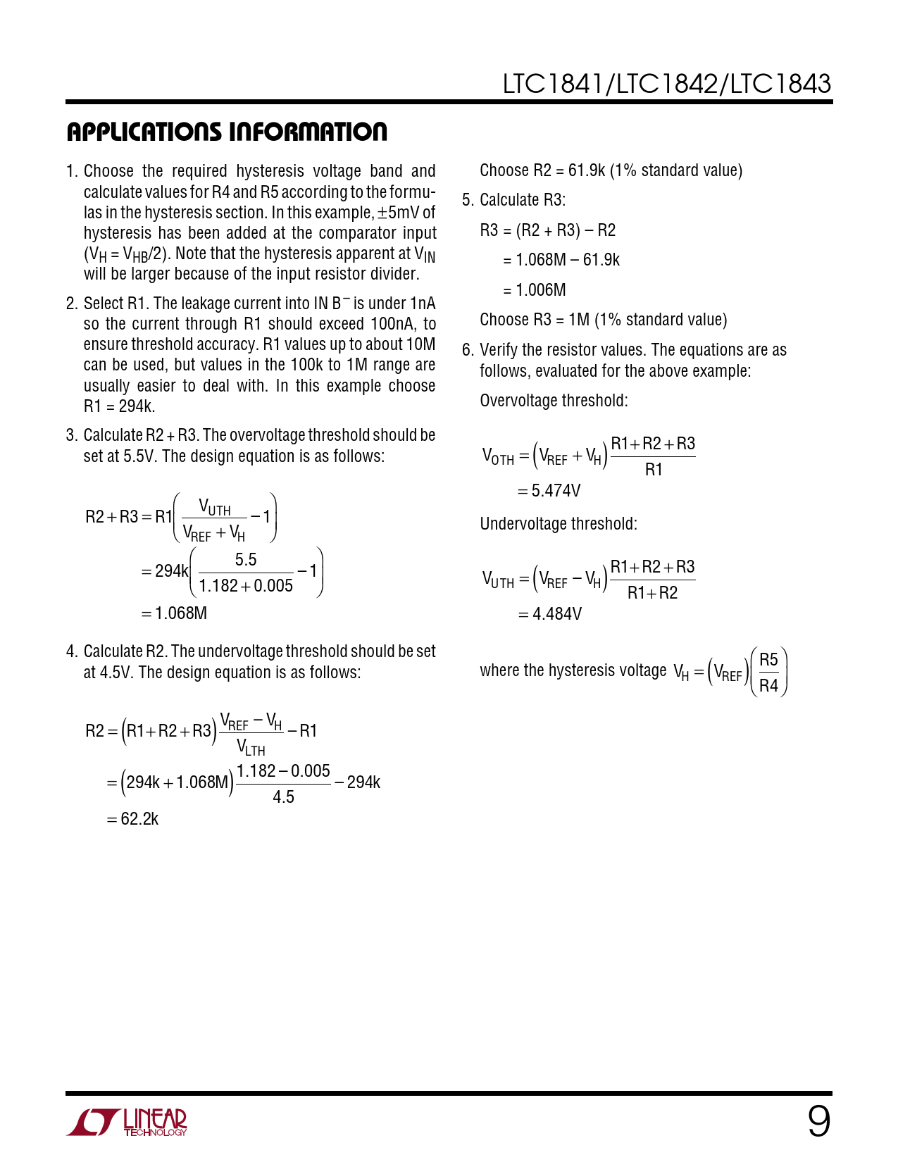 1. Choose the required hysteresis voltage band and Choose R2 = 61.9k (1% standard value) calculate values for R4 and R5 according to the formu- 5. Calculate R3: las in the hysteresis section. In this example, ±5mV of hysteresis has been added at the comparator input R3 = (R2 + R3) – R2 (VH = VHB/2). Note that the hysteresis apparent at VIN = 1.068M – 61.9k will be larger because of the input resistor divider. = 1.006M 2. Select R1. The leakage current into IN B – is under 1nA so the current through R1 should exceed 100nA, to Choose R3 = 1M (1% standard value) ensure threshold accuracy. R1 values up to about 10M 6. Verify the resistor values. The equations are as can be used, but values in the 100k to 1M range are follows, evaluated for the above example: usually easier to deal with. In this example choose R1 = 294k. Overvoltage threshold: 3. Calculate R2 + R3. The overvoltage threshold should be R1 R2 R3 set at 5.5V. The design equation is as follows: V = V ( +V ) + + OTH REF H R1 =  5 V 474 . V  R2 + R3 = R UTH 1 – 1  V + V Undervoltage threshold: REF H   5.5  = k 294 – 1 R1 R2 R3  = ( – ) + + 1.182 + 0.005  V V V UTH REF H R1+ R2 = 1. M 068 = . 4 V 484 4. Calculate R2. The undervoltage threshold should be set R5 at 4.5V. The design equation is as follows: where the hysteresis voltage V = V ( ) H REF R4 V – V R2 = R1 ( +R2+R REF H 3 – R1 ) VLTH 1.182 – 0 005 = . k 294 ( +1. M 068 – k 294 ) 4.5 = 62. k 2 9