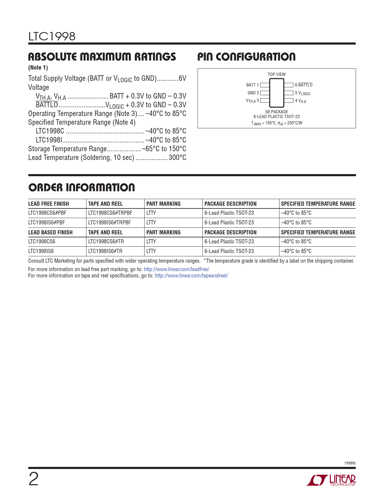 LTC1998 ABSOLUTE MAXIMUM RATINGSPIN CONFIGURATION(Note 1) TOP VIEW Total Supply Voltage (BATT or VLOGIC to GND) ..6V Voltage BATT 1 6 BATTLO V GND 2 5 VLOGIC TH.A, VH.A ... BATT + 0.3V to GND – 0.3V VTH.A 3 4 V BATTLO ..V H.A LOGIC + 0.3V to GND – 0.3V Operating Temperature Range (Note 3).. –40°C to 85°C S6 PACKAGE 6-LEAD PLASTIC TSOT-23 Specifi ed Temperature Range (Note 4) TJMAX = 150°C, θJA = 250°C/W LTC1998C .. –40°C to 85°C LTC1998I.. –40°C to 85°C Storage Temperature Range ... –65°C to 150°C Lead Temperature (Soldering, 10 sec) .. 300°C ORDER INFORMATIONLEAD FREE FINISHTAPE AND REELPART MARKINGPACKAGE DESCRIPTIONSPECIFIED TEMPERATURE RANGE LTC1998CS6#PBF LTC1998CS6#TRPBF LTTY 6-Lead Plastic TSOT-23 –40°C to 85°C LTC1998IS6#PBF LTC1998IS6#TRPBF LTTY 6-Lead Plastic TSOT-23 –40°C to 85°C LEAD BASED FINISHTAPE AND REELPART MARKINGPACKAGE DESCRIPTIONSPECIFIED TEMPERATURE RANGE LTC1998CS6 LTC1998CS6#TR LTTY 6-Lead Plastic TSOT-23 –40°C to 85°C LTC1998IS6 LTC1998IS6#TR LTTY 6-Lead Plastic TSOT-23 –40°C to 85°C Consult LTC Marketing for parts specifi ed with wider operating temperature ranges. *The temperature grade is identifi ed by a label on the shipping container. For more information on lead free part marking, go to: http://www.linear.com/leadfree/ For more information on tape and reel specifi cations, go to: http://www.linear.com/tapeandreel/ 1998fb 2